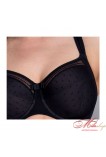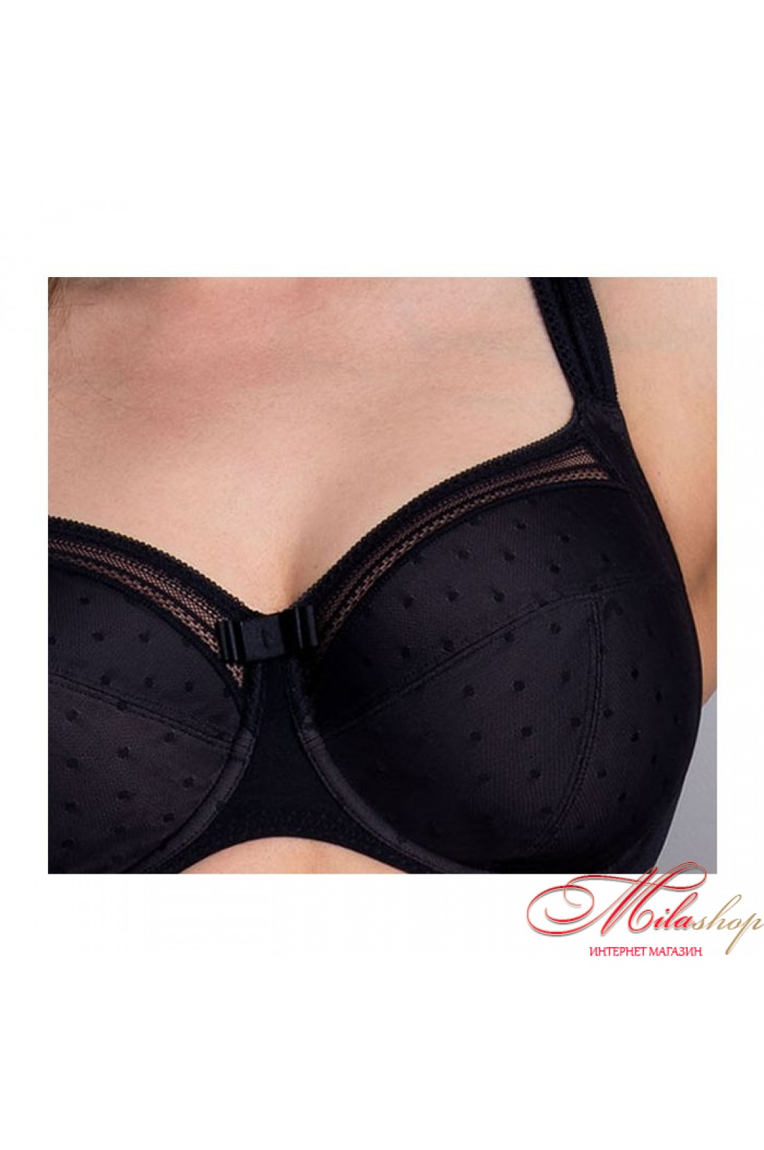 Бюстгальтер специального кроя для большой груди - чашка состоит из четырех деталей, мощный боковой подкрой надежно поддерживает грудь, собирая ее с боков и выравнивая силуэт. Чашки покрыты нежным тюлем в точечку, за счет чего модель выглядит практически невесомой. Полупрозрачная вставка по вырезу визуально облегчает зону декольте. Необычно оформлены бретели - они 2х слойные и декорированы тюлем.