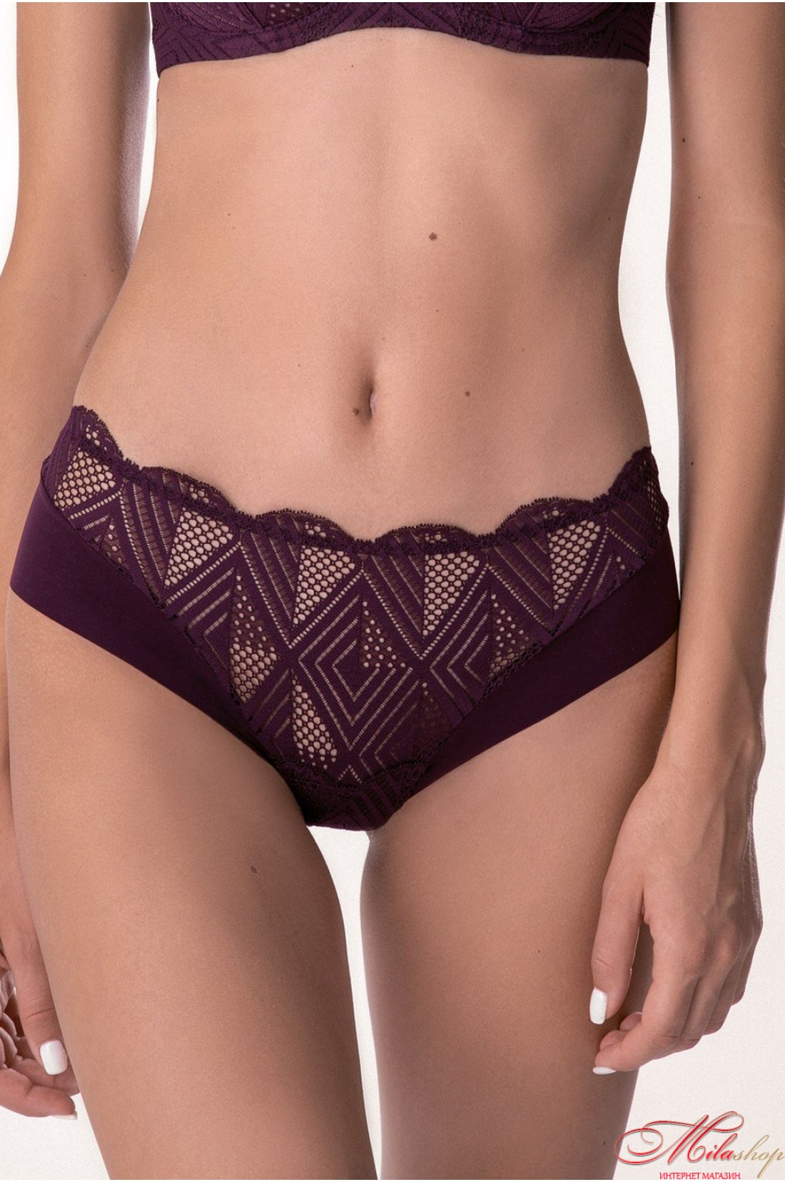 - Трусики-бразилиана из французского кружева и итальянского бесшовного полотна. Наполовину прикрывают ягодицы, подчеркивая их форму. Бесшовные края не выделяются под одеждой. Завышенная линия талии. Хлопковая гигиеническая ластовица.