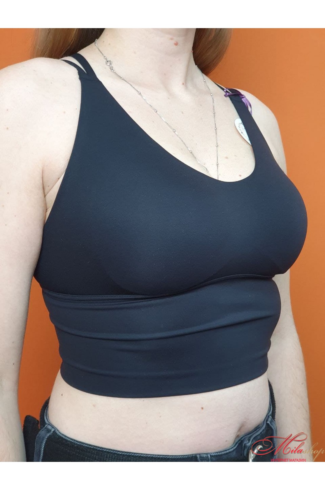 Бесшовный топ из гладкого эластичного полотна. Модель без каркасов и застежек. Подкладки съемные из тонкого поролона. Двойные бретели отстегиваются сзади.