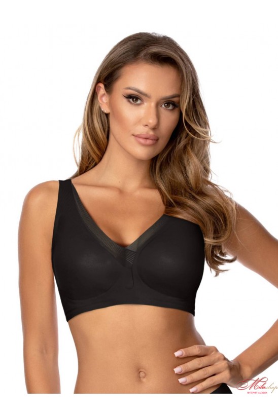 Гладкий однотонный бра-топ, мягкие чашки без косточек со специальный кроем формируют и поддерживают грудь, не сдавливая ее, съемные поролоновые каплевидные вкладыши для эффекта пуш-ап, бесшовные края с лазерной обработкой не выделяются под одеждой, широкий пояс и спинка для дополнительной поддержки, широкие бретели не регулируются по длине, застежка на спине: 4 крючка на 5 позиций.