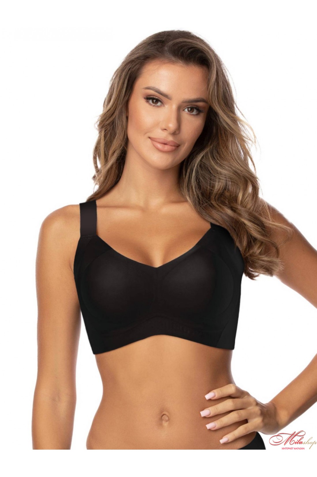 Гладкий однотонный бра-топ, мягкие чашки без косточек со специальный кроем формируют и поддерживают грудь, не сдавливая ее, съемные поролоновые каплевидные вкладыши для эффекта пуш-ап, бесшовные края с лазерной обработкой не выделяются под одеждой, широкий пояс и спинка для дополнительной поддержки, широкие бретели не отстегиваются, регулируются по длине, застежка на спине: 4 крючка на 5 позиций.