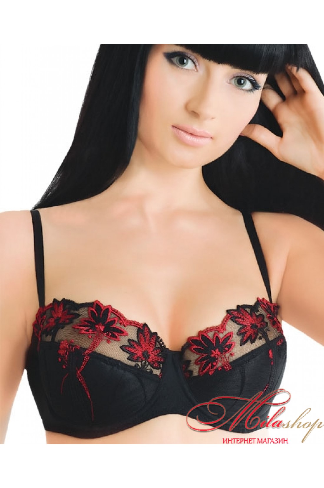 Бюстгальтер на каркасах. На чашках — кружево, вышитое на сетке, нижняя деталь чашки на поролоне с х/б подкладкой. Бюсты с вышивкой недорого.
