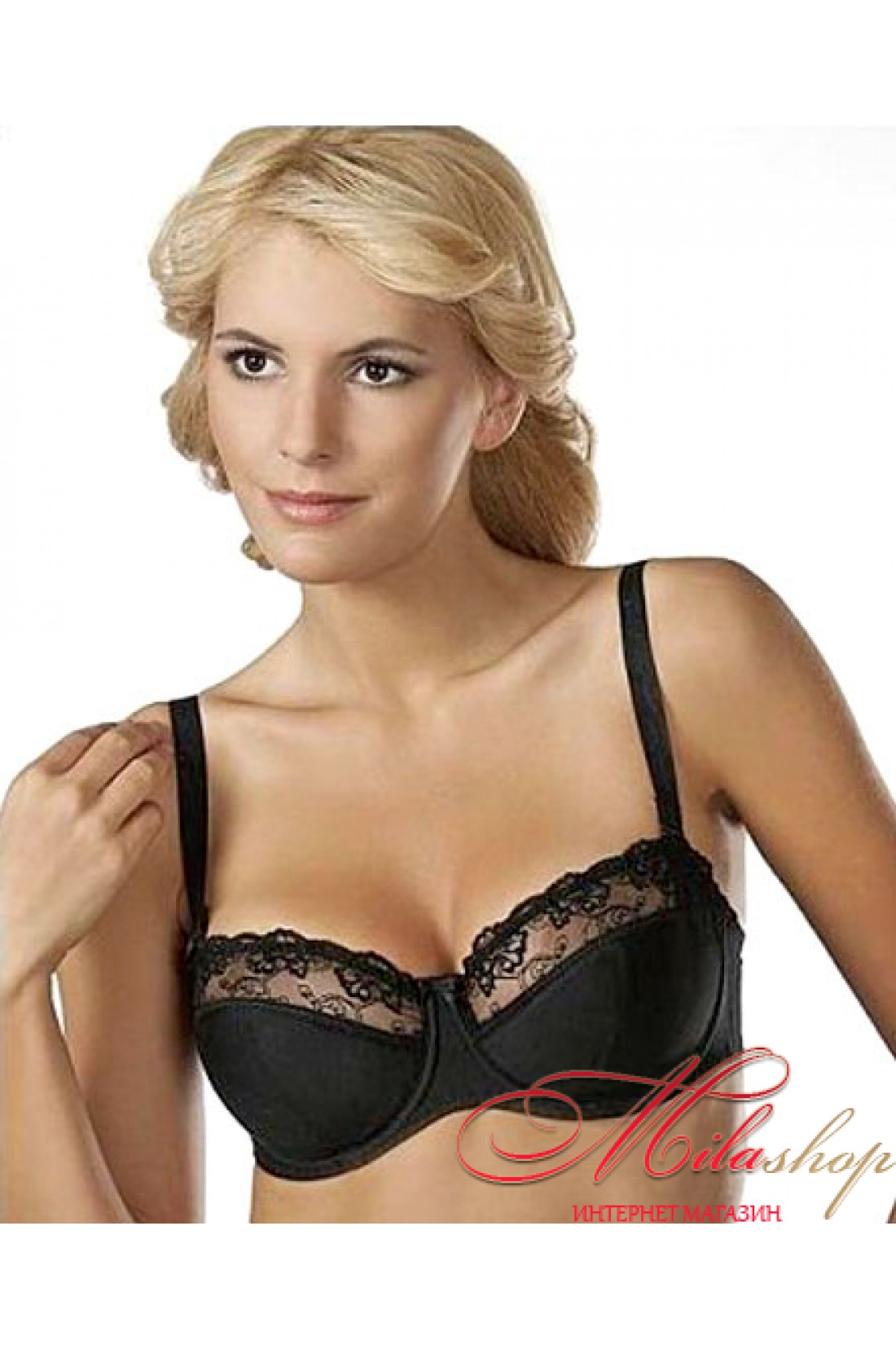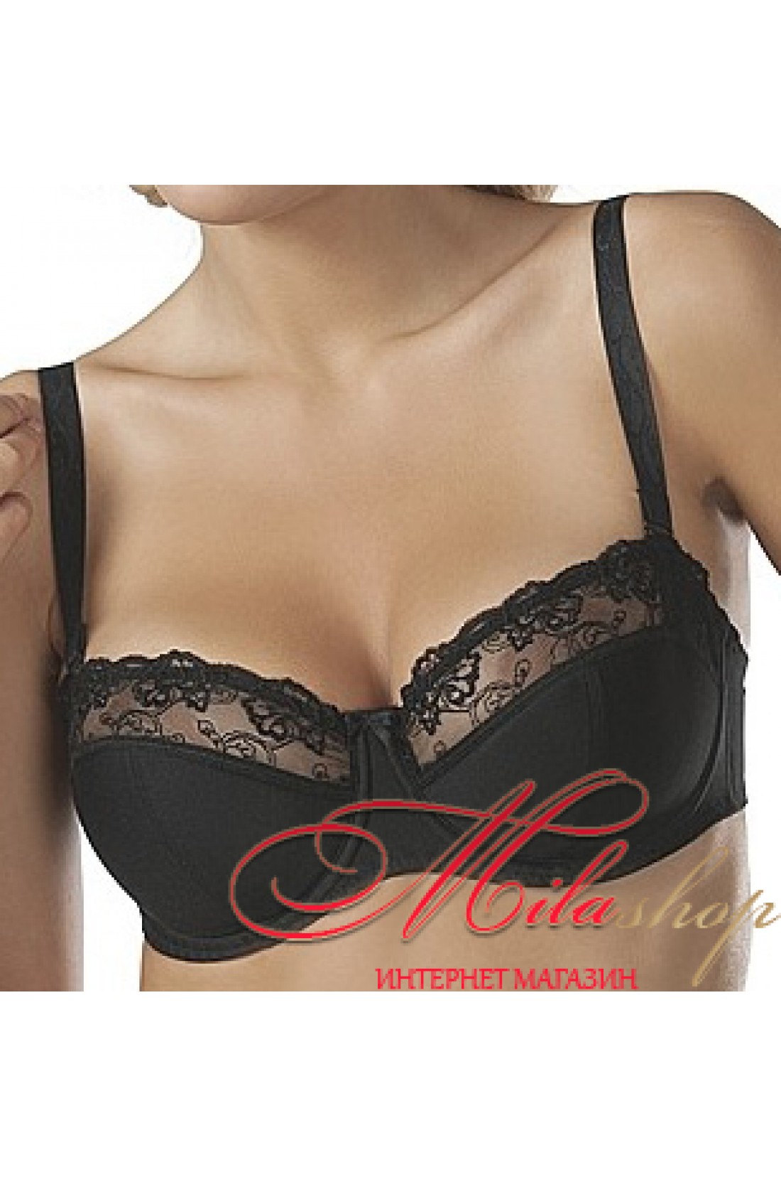 Бюстгальтер балконет из неэластичного трикотажного полотна, неэластичной вышивки и эластичного сетчатого полотна. На каркасах. Нижние детали чашек на дубляже с хлопком. Съемные бретели. Отделка- бантик.