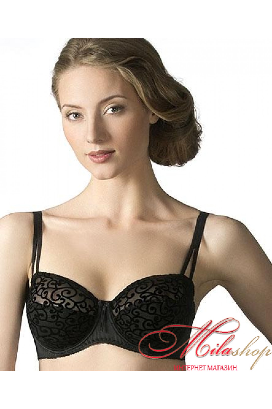 Бюстгальтер балконет из эластичного сетчатого полотна с набивкой флок и эластичного трикотажного полотна. На каркасах. Нижние детали чашек на подкладке из неэластичного трикотажного полотна. Декоративные бретели с раздвоенным участком. Отделка- бантик.