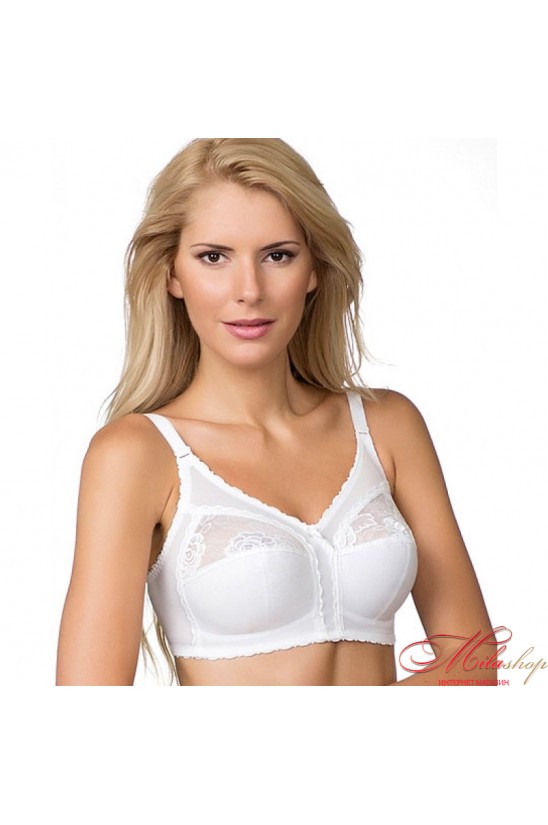 Бюстгальтер из неэластичного кружевного ламинированного полотна, неэластичного трикотажного полотна, ламинированного хлопком и эластичного трикотажного полотна. Без каркасов. Нижние детали чашек из неэластичного трикотажного полотна ламинированного хлопком. Отделка - узкое кружево и бантик на центральной детали бюстгальтера. На сайте представлены бюстгальтеры без косточек от лучших производителей!