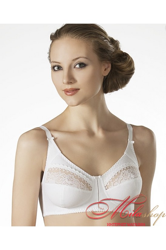 Бюстгальтер из эластичного и неэластичного трикотажного хлопкового полотна и эластичного кружева. Без каркасов. Боковая и нижние детали чашек ламинированы неэластичным трикотажным хлопковым полотном. Отделка - декоративный шов мережка на центральной детали бюстгальтера и бантики.