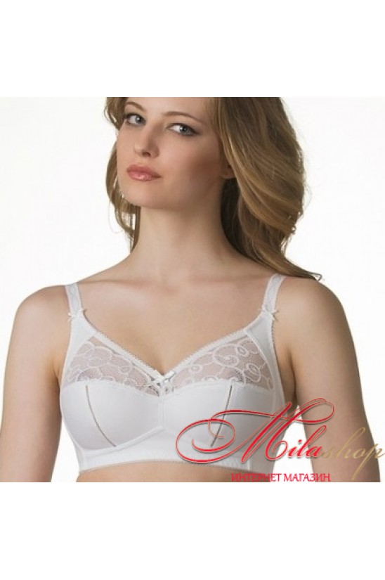 Бюстгальтер из эластичного трикотажного полотна, неэластичного ламината с внутренним хлопковым слоем и эластичного кружева, Без косточек. Мягкие чашки с тройным членением и боковой корректирующей деталью. Отделка - атласные бантики. Бюстгальтеры без косточек - это здоровье вашей груди!