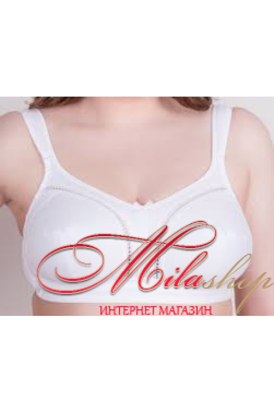 Бюстгальтер из неэластичного и эластичного трикотажного хлопкового полотна, без каркасов. Детали чашек на подкладке из неэластичного трикотажного полотна, ламинированного хлопком. Отделка - тесьма с эффектом «мережки» и бантик.