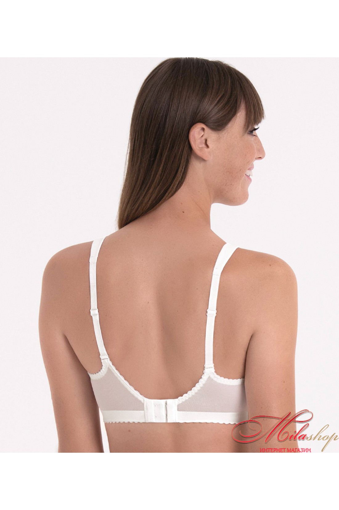 Входит в серию Sita. Тонкая треугольная чашка без косточки. Чашка сшита из четырех сегментов, внутри бесшовная. Верхняя часть чашки изготовлена из кружева с цветочным орнаментом. Гладкая часть чашки из материала в вертикальную полоску. Линия декольте высока, вырез не глубок. Эластичные бретели с двойным швом, регулируются по высоте.