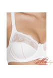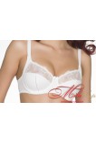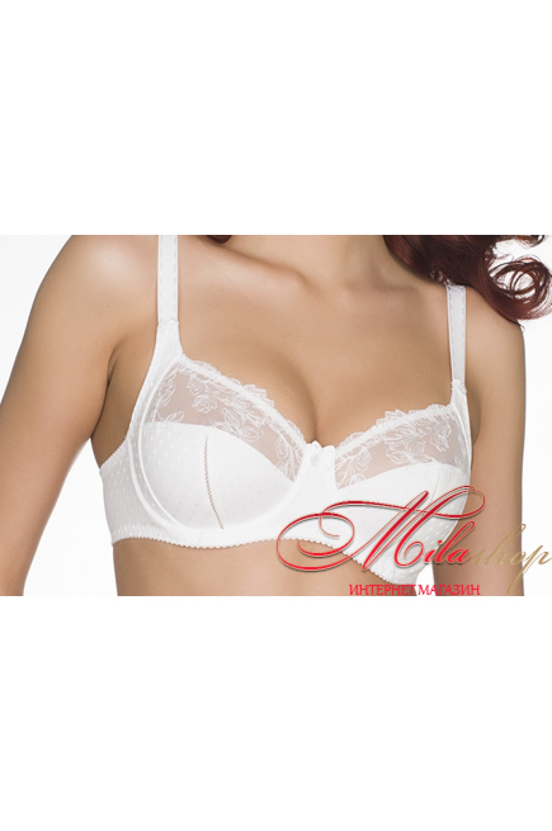 Бюстгалтер из эластичного трикотажного жаккардового полотна и неэластичной вышивки, на каркасах. Мягкие чашки с боковой корректирующей деталью. Нижние детали чашек из ламинированного полотна. Отделка - атласные бантики и декоративный шов "мережка" на нижних деталях чашек.