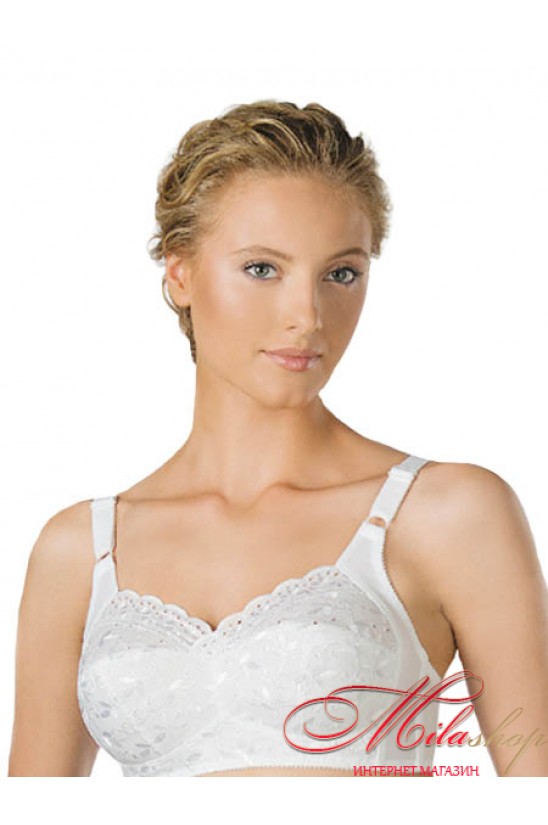 Бюстгальтер из вышитого тканого полотна и эластичного трикотажного полотна. Без каркасов. Чашки с боковой корректирующей деталью. Нижние детали чашек на подкладке из тканого хлопкового полотна. Упругие пластины в боковых деталях стана. Отделка - шитье на тканом хлопковом полотне.