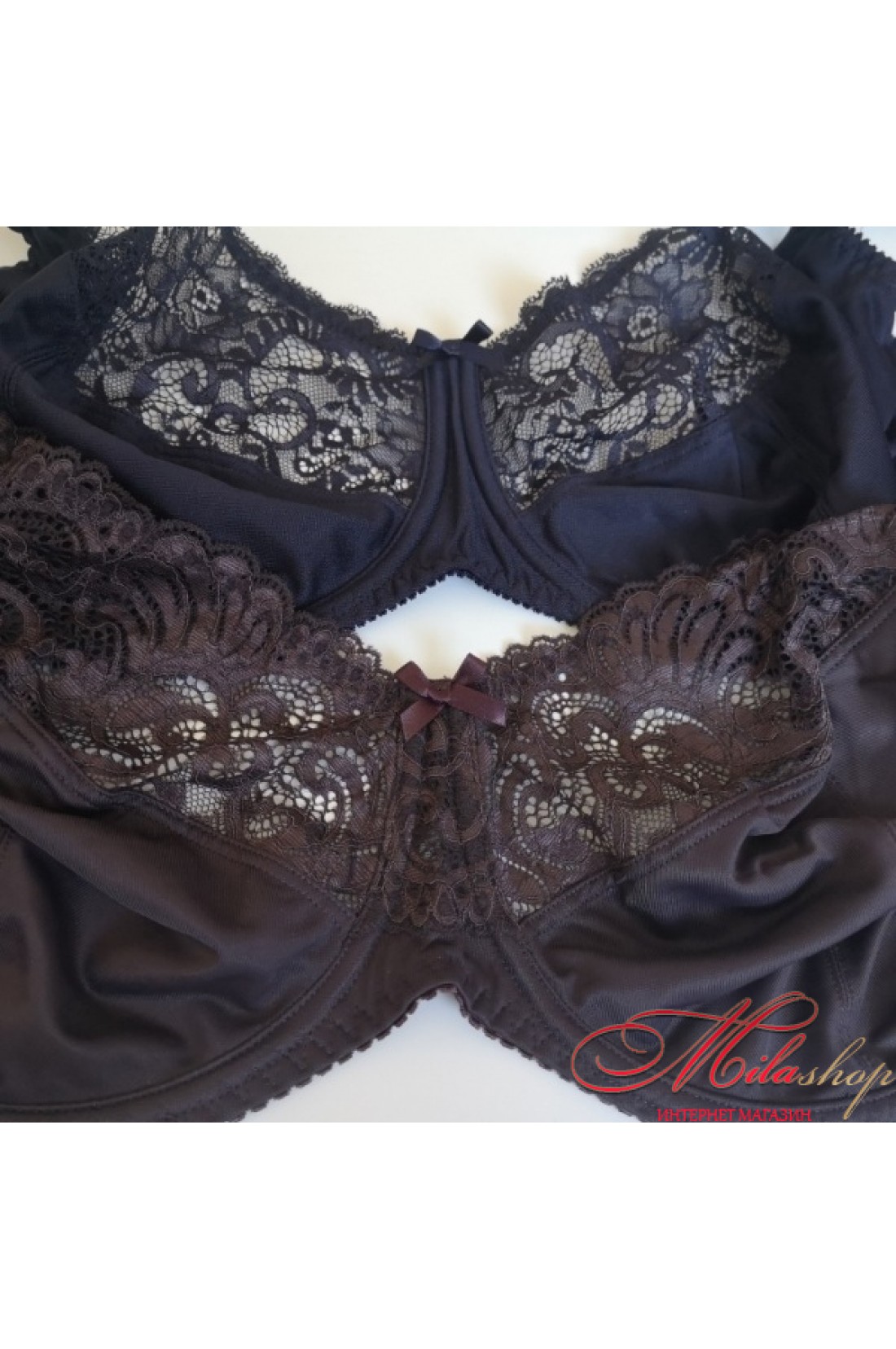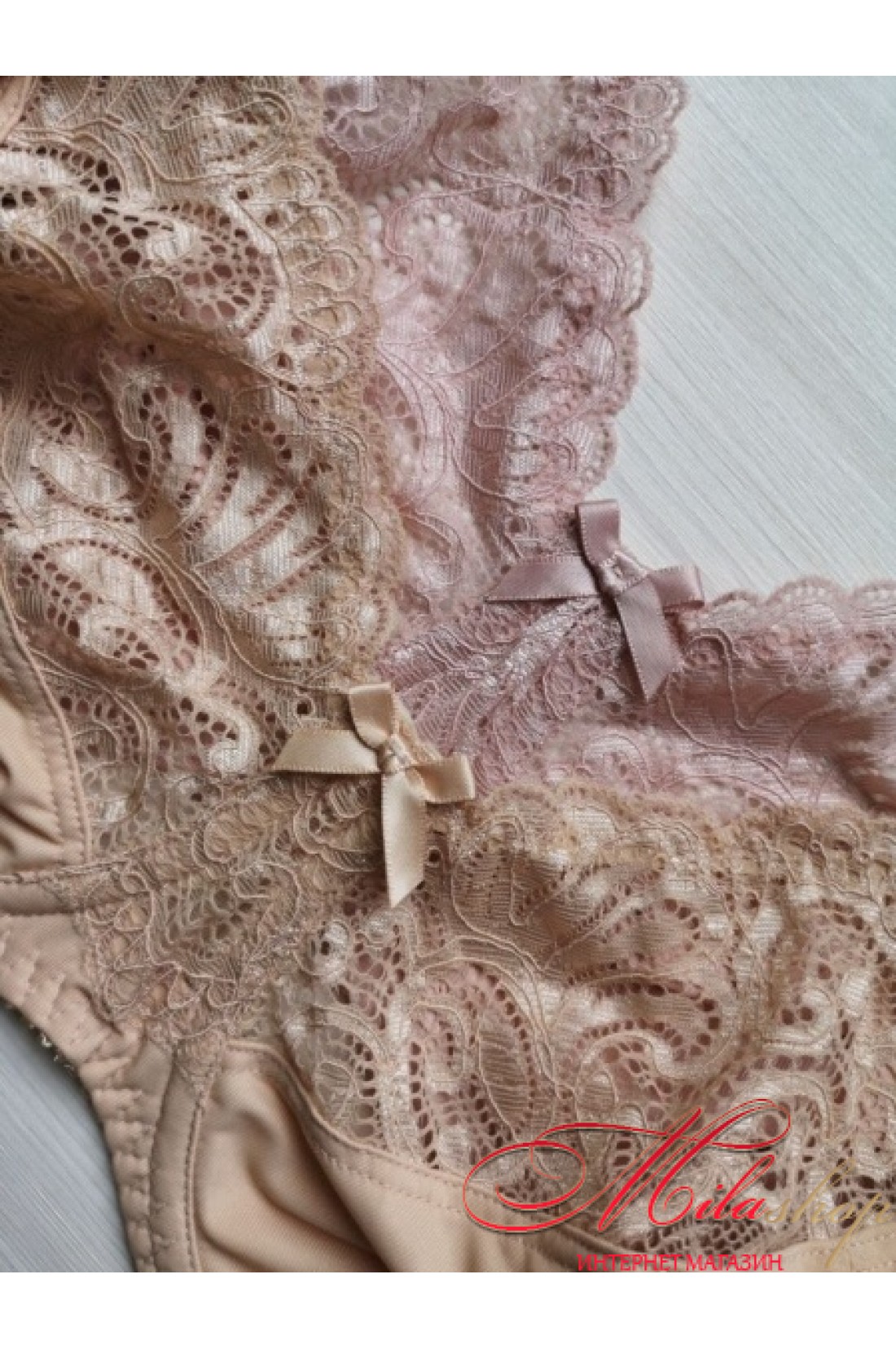 Бюстгальтер из эластичного полотна, трикотажного полотна и эластичного кружева. На каркасах. Мягкие чашки с тройным диагональным членением. Отделка - бантики. Застёжка в 4 ряда крючков.
