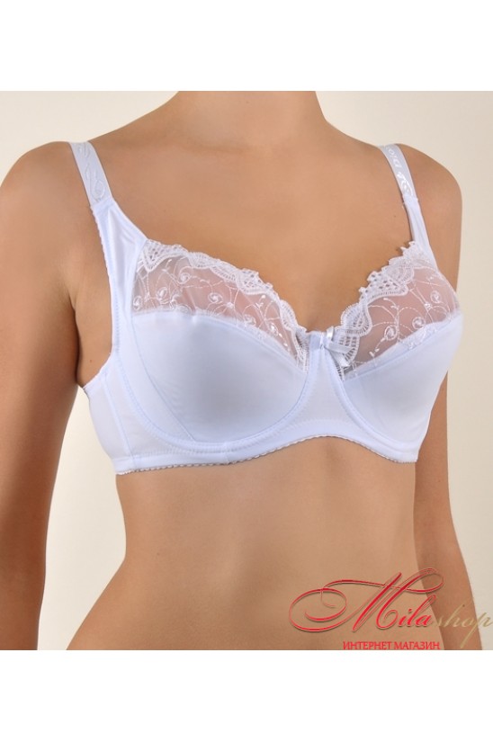 Бюстгальтер полупоролон с широкими бретелями. Верхняя часть бюстгальтера выполнена из неэластичного сетчатого полотна с вышивкой, нижняя часть из гладкого неэластичного полотна. Между чашками украшен атласным бантиком.