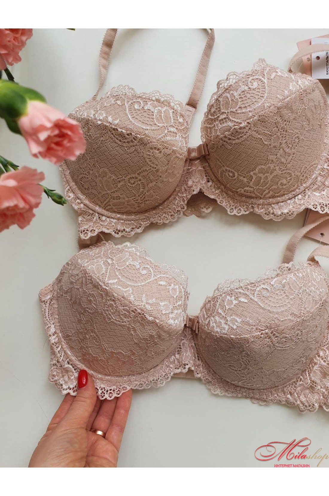 Комфортный бюстгальтер выполнен из кружева на дублированной хлопком основе, на каркасах. Создает красивую форму груди: приподнимает и собирает к центру. Съемные вкладыши позволяют выбрать максимально удобную посадку груди. Открытая линия декольте в области бретелей подходит к нарядам с широким вырезом. Украшен стильным французским бантиком.