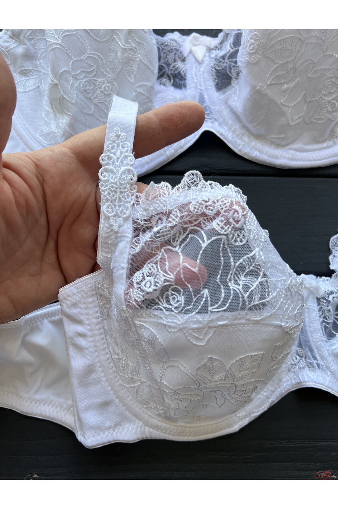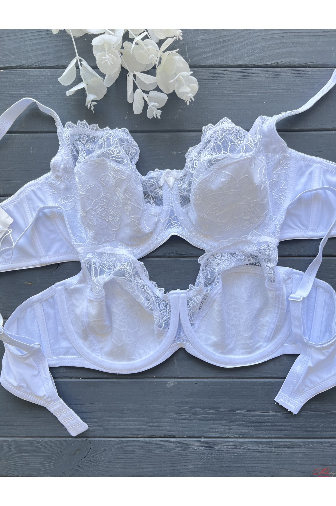 Бюстгальтер с мягкими чашками, не съемными бретелями. Чашки бюстгальтера имеют боковую вставку. Украшен вышивкой