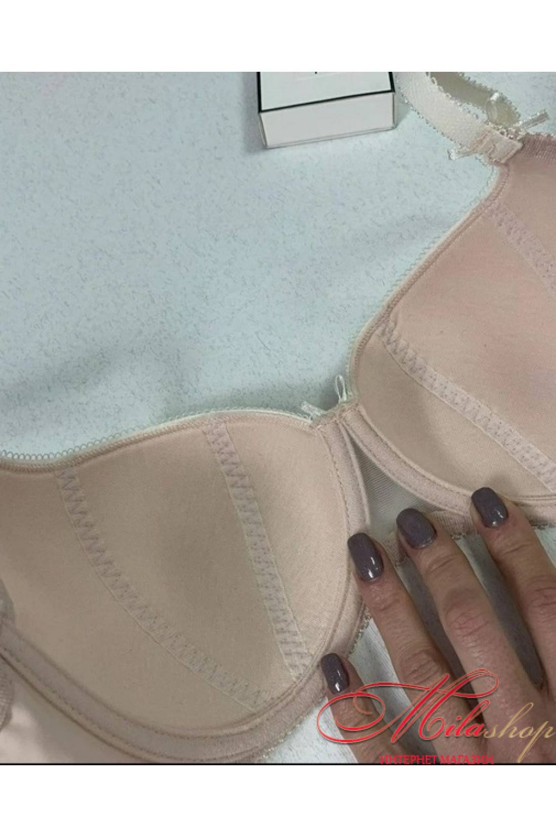 Бюстгальтер балконет приподнимает и держит грудь снизу, образуя декольте. Внутренняя часть чашки изготовлена из хлопкового полотна. Концы металлических каркасов защищены специальной капсулой.