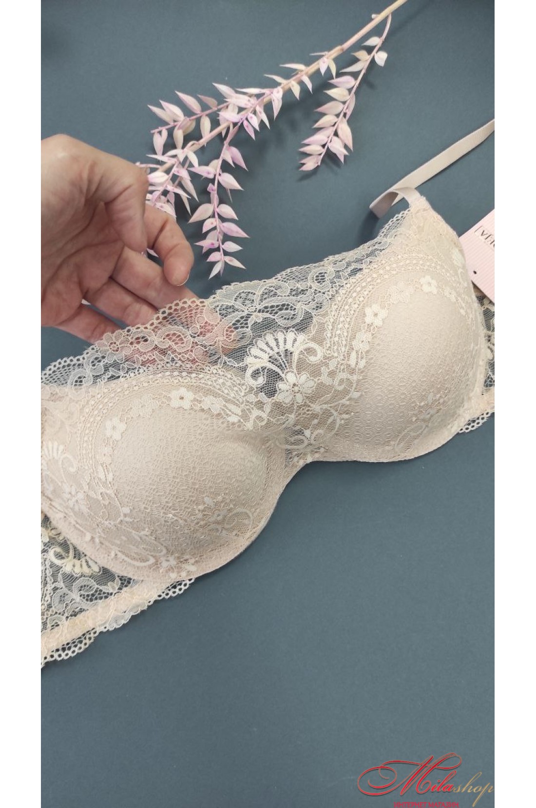 - Прекрасный бюстгальтер-бандо с формованными чашками из облегченного поролона на косточках сохраняют свою форму и адаптируются к груди. Чашки имеют легкий эффект push-up, материал чашек пропускает воздух и не сдавливает грудь. Сверху бюстгальтер покрыт красивым прозрачным кружевом. Бретели не отстегиваются, регулируются по длине. Кружевная спинка.