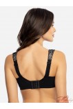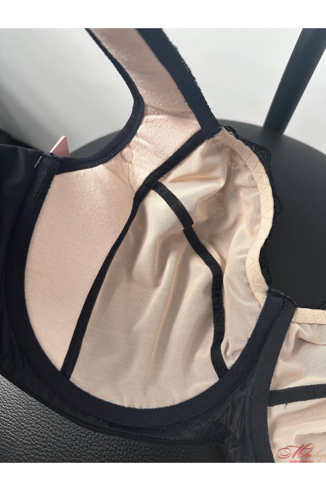 Базовый бюстгальтер для поддержки пышной груди, глубокие мягкие чашки на косточках поддерживают грудь и придают ей округлую форму, с внешней стороны чашки неэластичная корректирующая вставка для дополнительной поддержки, широкие бретели не отстегиваются, регулируются по длине, снимают нагрузку со спины, застегивается на спине крючками.