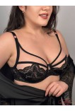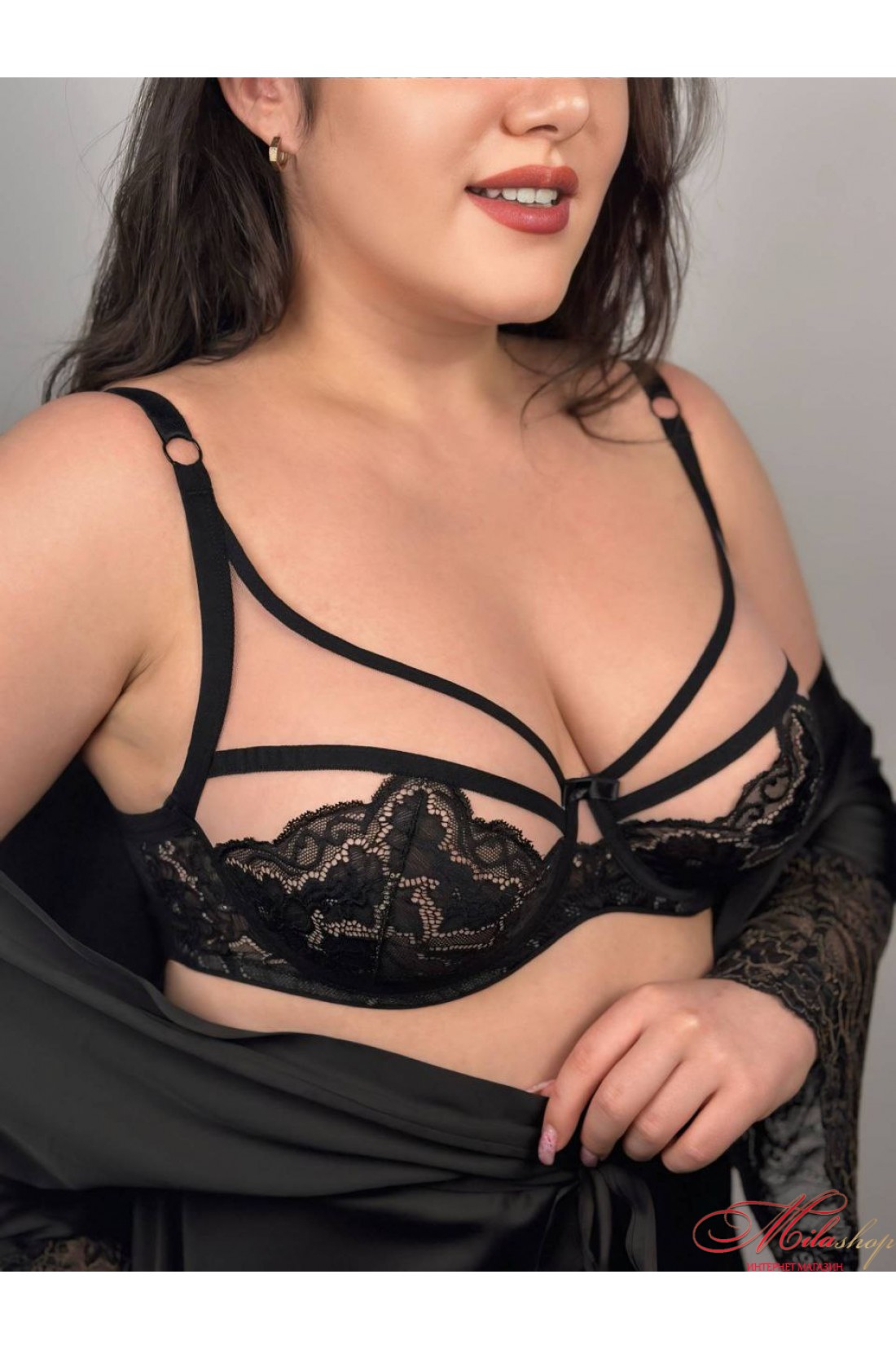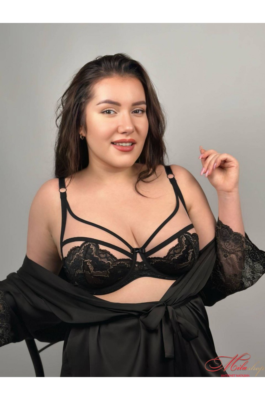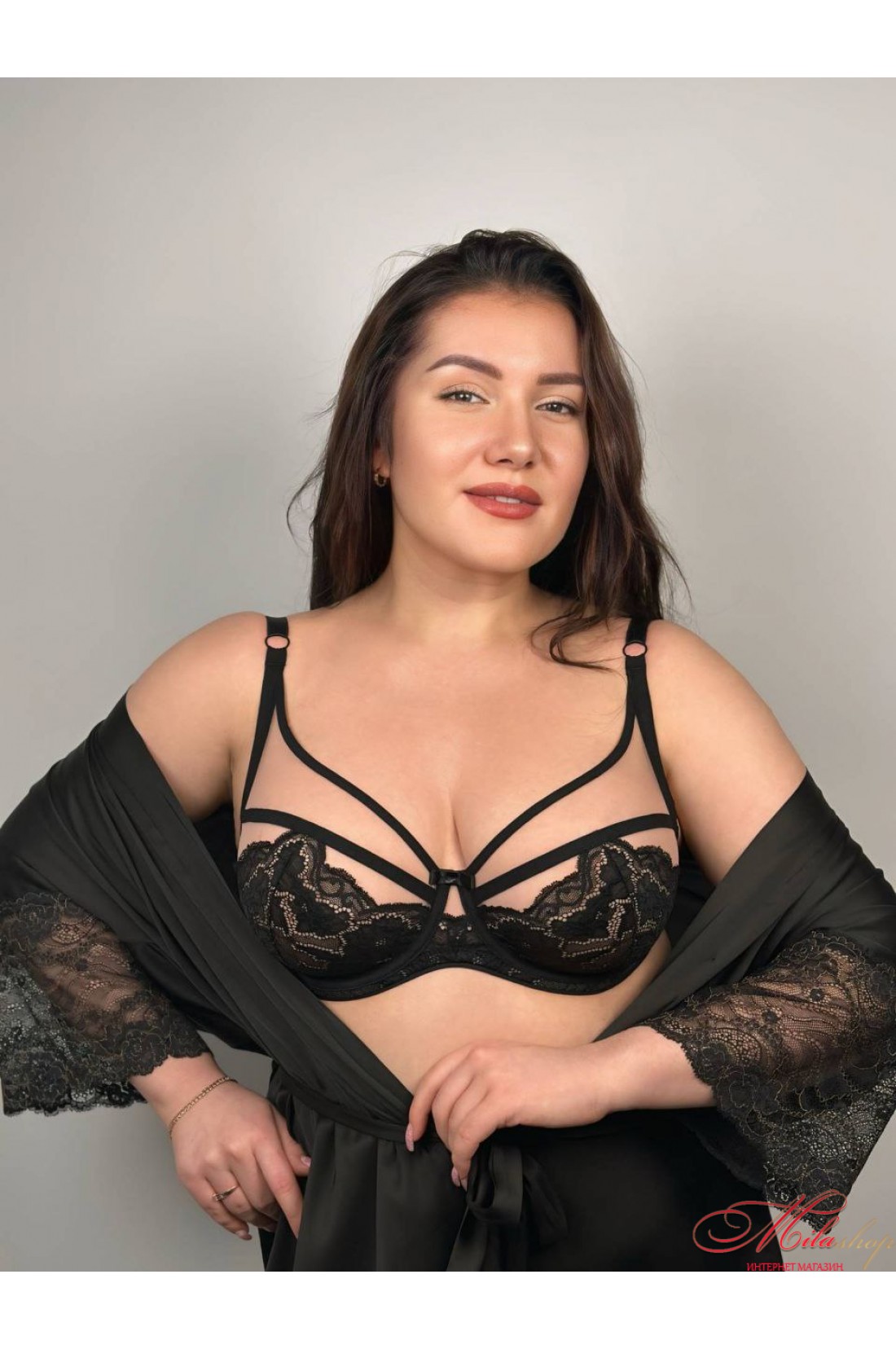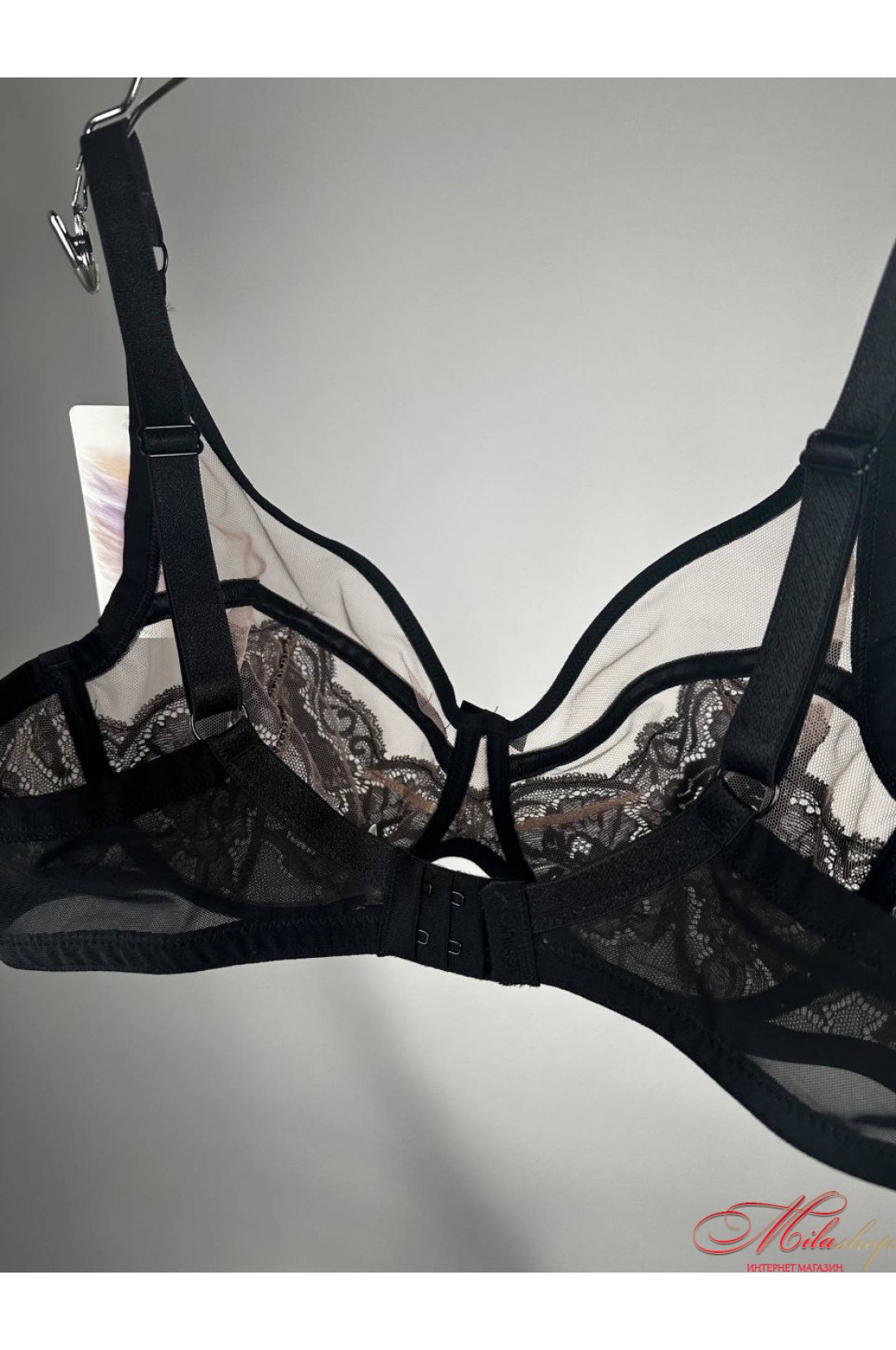Бюстгальтер с кружевом и микросеткой, мягкие чашки на косточках полностью покрывают грудь и собирают ее к центру. Бретели не отстегиваются, регулируются по длине, кружевная спинка, застегивается на спине крючками.