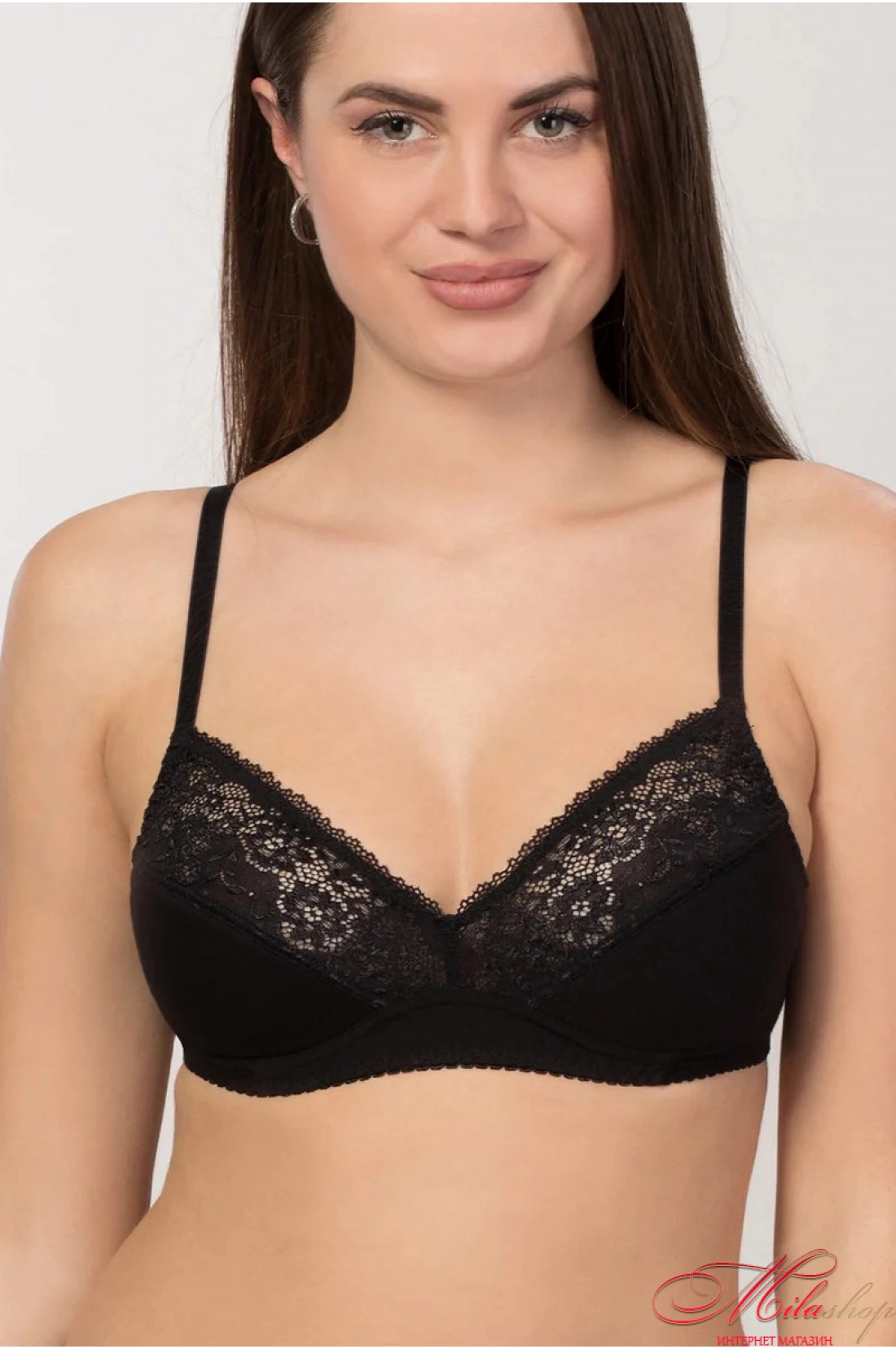 Бюстгальтер без каркасов из трикотажного хлопкового полотна и эластичного кружева. Нижние детали чашек дублированы тонким поролоном. Размерный ряд: 65A 65B 65C, 70A 70B 70C, 75A 75B 75C. Изделия во всех размерах имеют – 2 ряда крючков. Ширина бретельной ленты – 1 см.