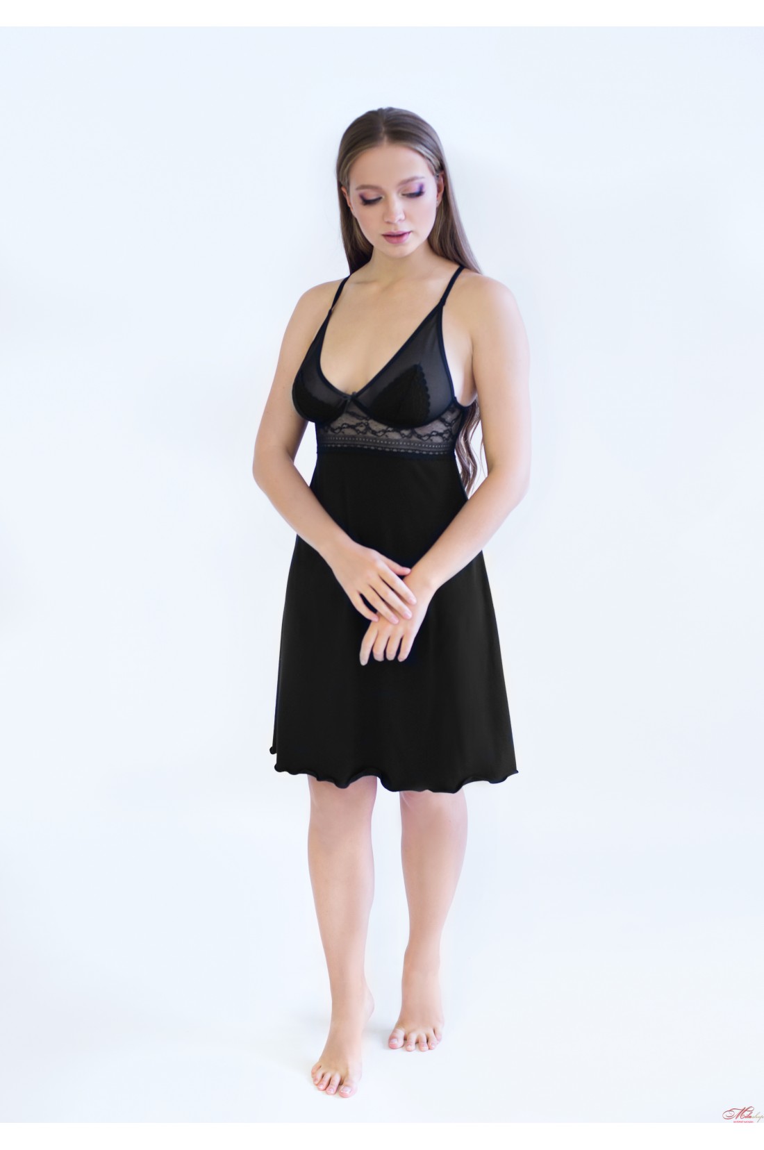 Ночное платье Marsana, в котором верхняя частьвыполнена как бралетт с прозрачными чашечками, по центру который есть черные кружевные вставки, прикрывающие грудь. Тонкие регулируемые бретельки и комфортная длина до колена - отличное сочетание красоты и удобства. Материал: стрейч-кулир. Состав ткани: 46% хлопок, 46% модал 8% эластан