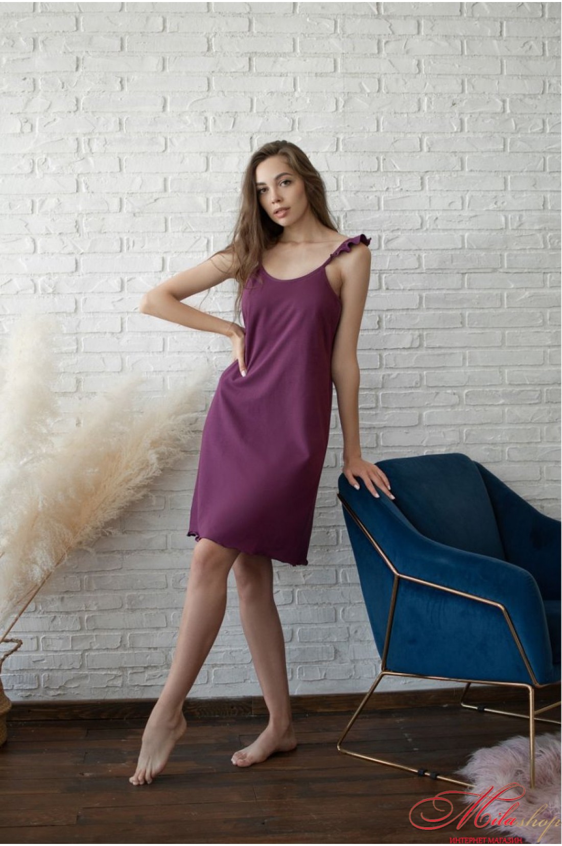 Ночная рубашка из хлопка. Хлопок хорошо пропускает воздух и впитывает влагу, не раздражает чувствительную кожу, приталенный крой. Бретели регулируются по длине, украшены рюшами, без застежек.