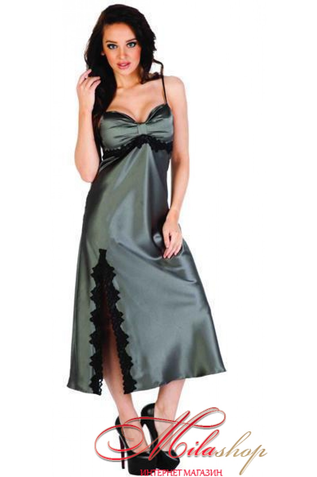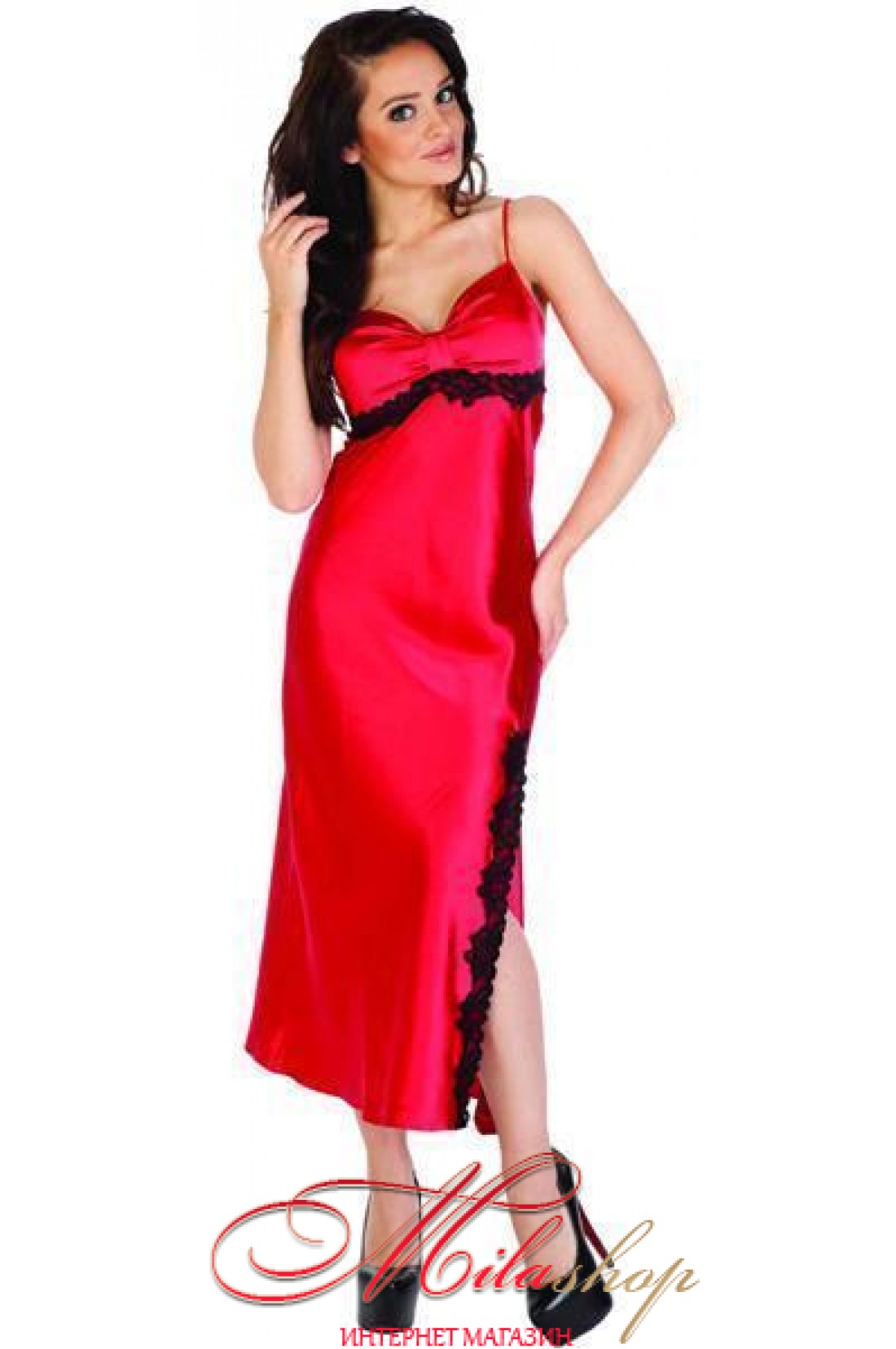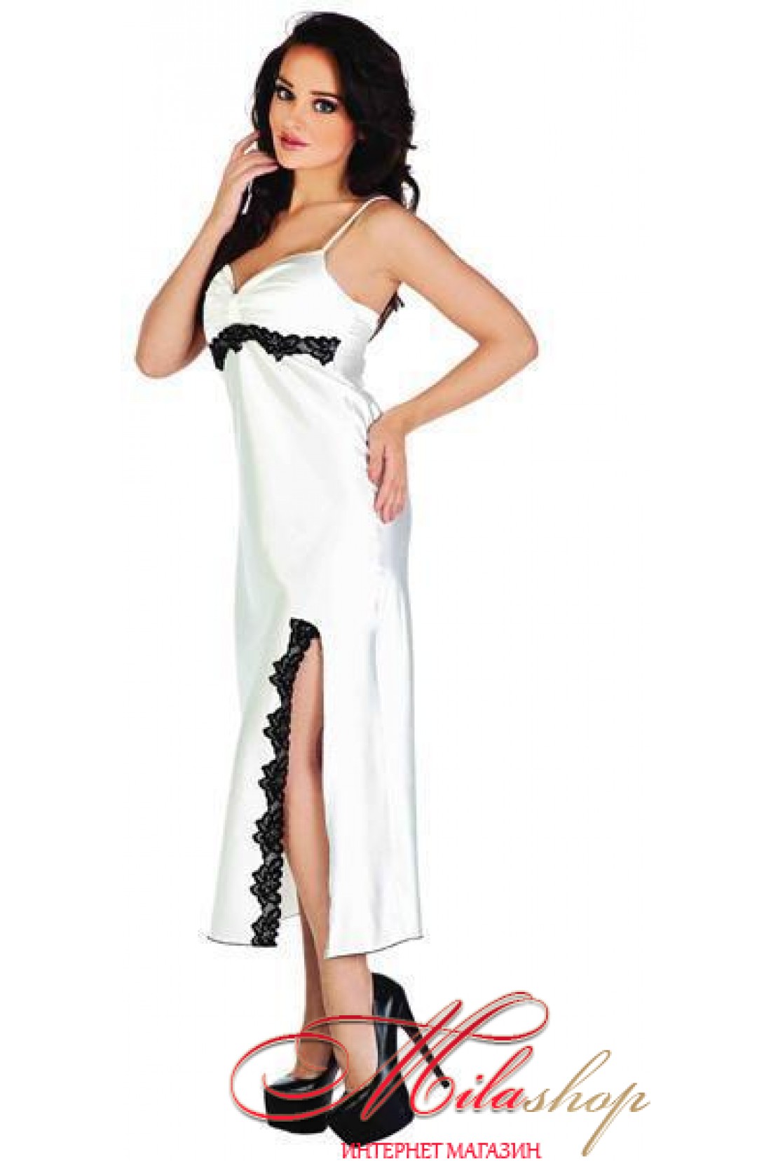 Элегантная длинная сорочка из нежного атласного полотна. Лиф присобран. Под грудью украшена кружевом. Изюминкой данной модели является разрез в передней части, который эротично оголяет ножку.