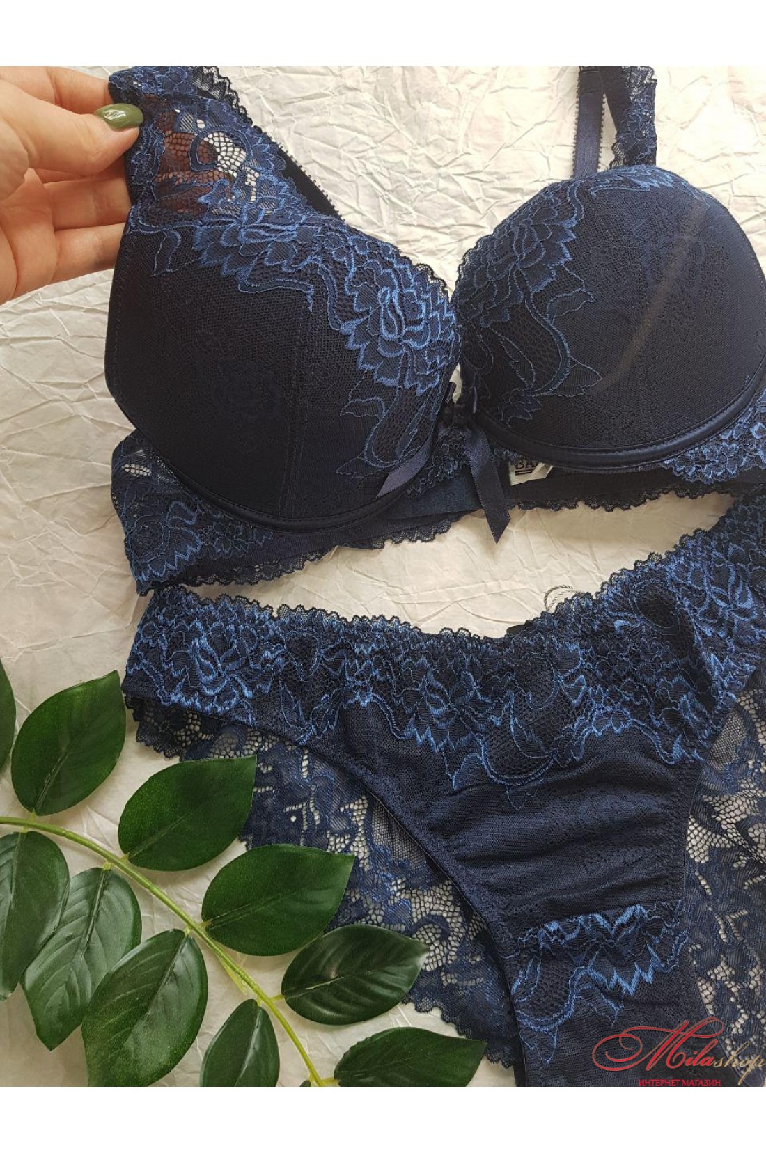 Комплект с кружевной бретелью и гелевым пушап.Спинка бюста тоже кружевная, между чашек прикреплен бантик. Кружевные трусики-слип также сзади украшены небольшим бантиком.