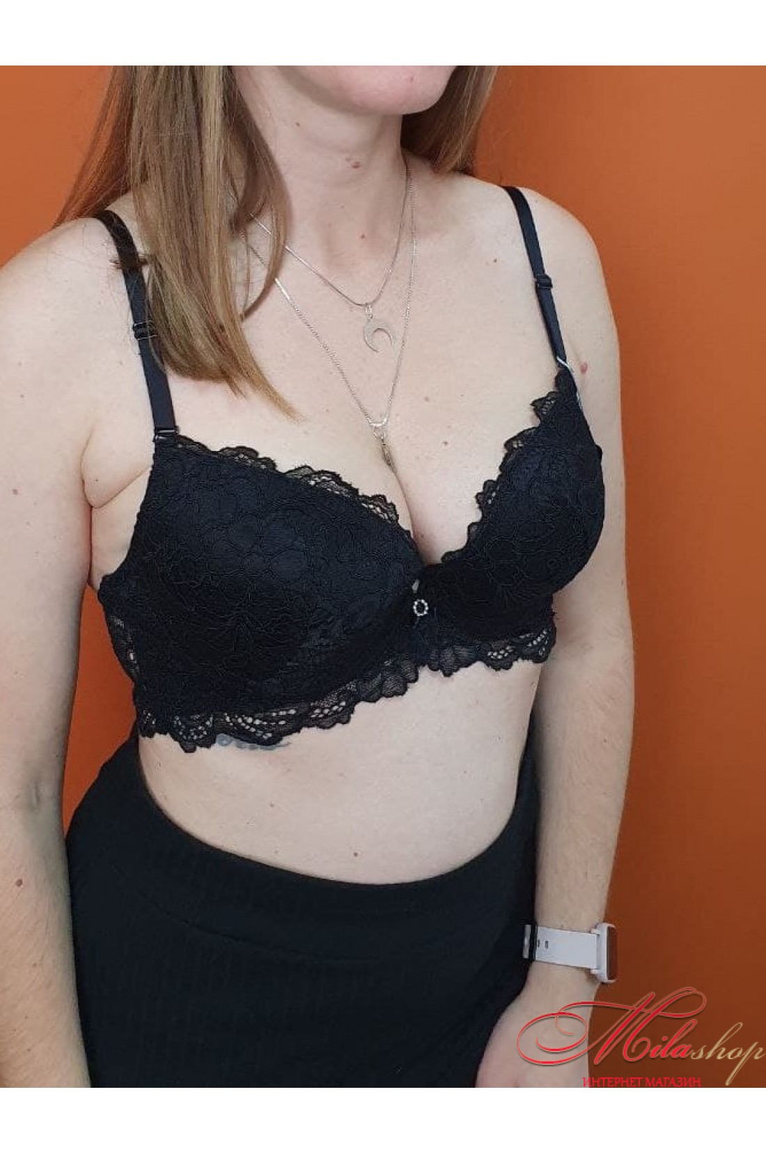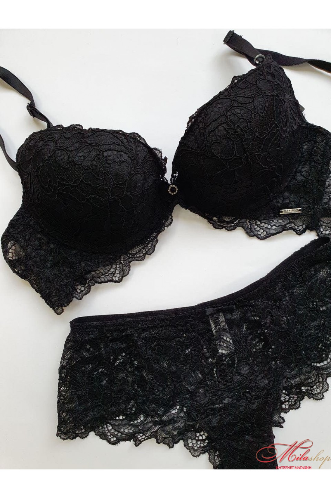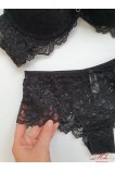 Роскошный кружевной комплект с небольшим поролоновым пуш-ап. Трусики средней посадки сзади с вертикальным швом, что подчеркивает фигуру.