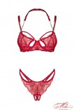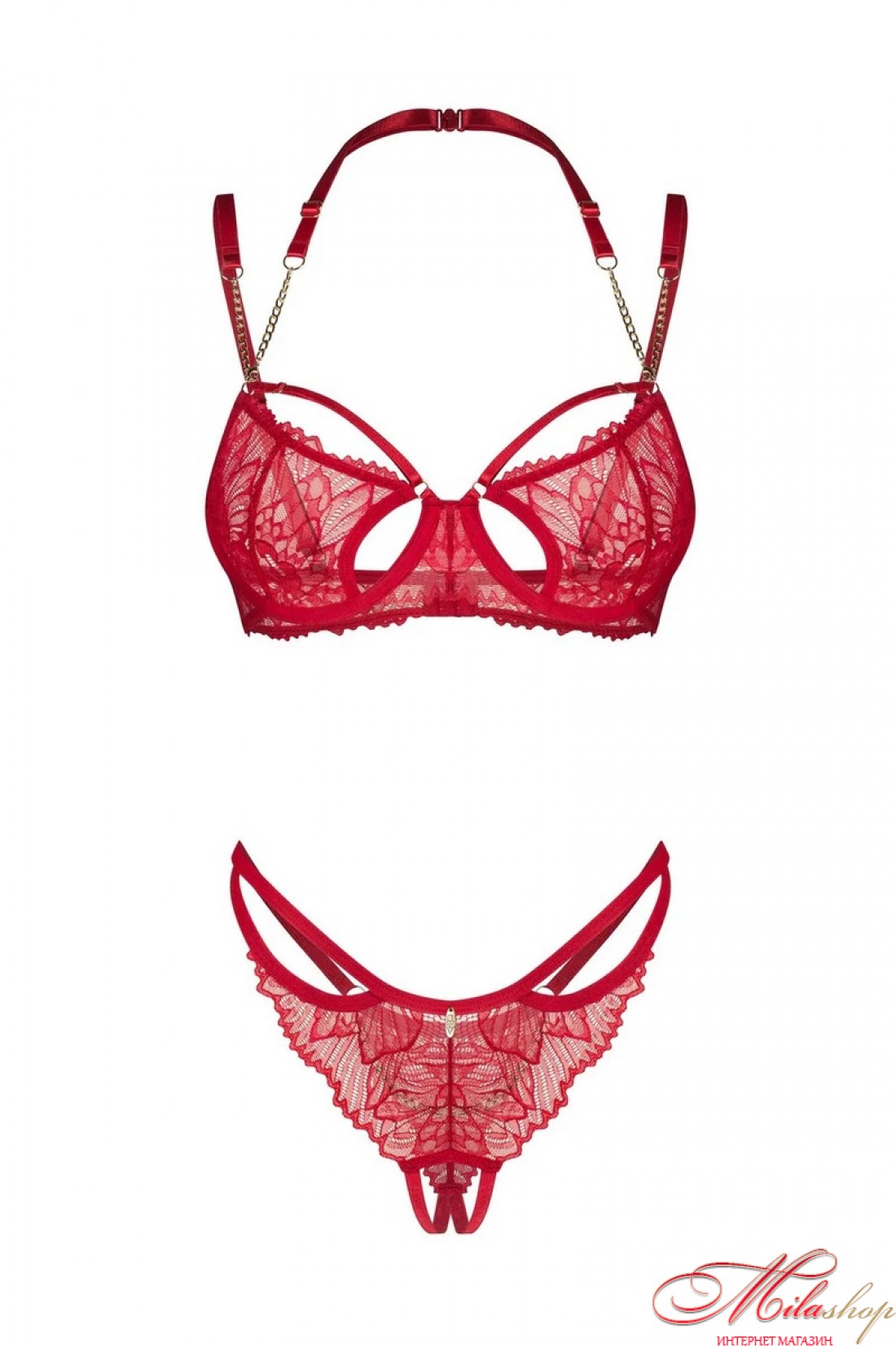 Комплект белья из полупрозрачного кружева, мягкие чашки поддерживают грудь и подчеркивают естественную форму груди, на косточках, плечевые бретели регулируются по длине, лиф застегивается на спине крючками, стринги трусики, вырез в ластовице.
