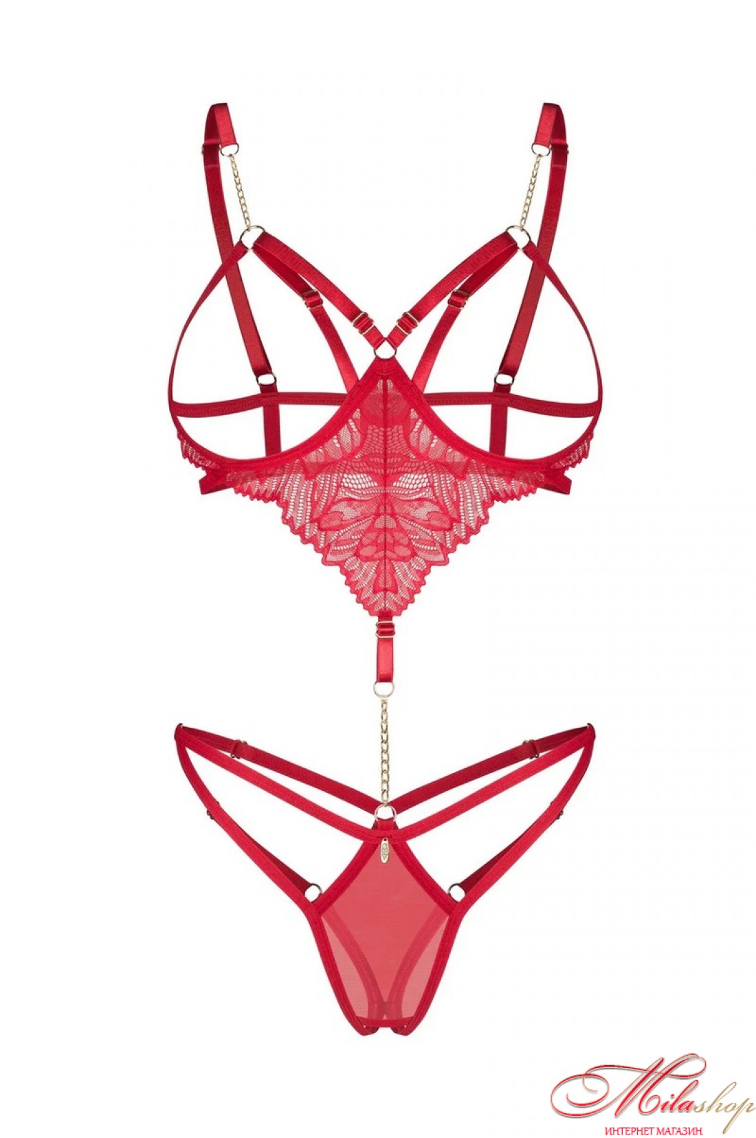 Эротическое боди с кружевом и цепочками, открытые чашки с косточками внизу поддерживают грудь и делают ее округлыми, лиф застегивается на спине крючками, плечевые бретели регулируются по длине, низ в виде стринги трусиков, вырез в ласточке.