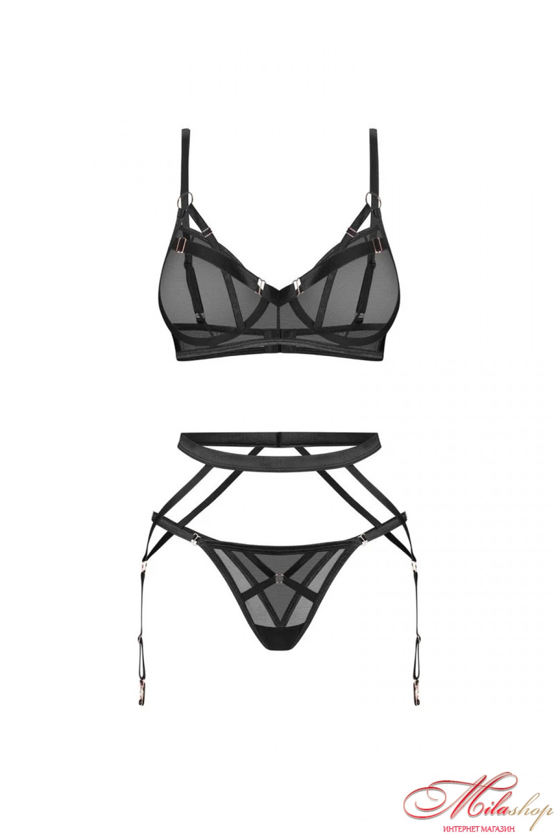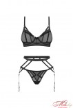 Комплект из прозрачной микросетки; бюстгальтер с мягкими чашками на косточках подчеркивает естественную форму груди. Бретели не отстегивается, регулируется по длине; застегивается на спине крючками; трусики стринги с тонкими боковинками; в комплекте пояс для чулок с регулируемыми пажами.