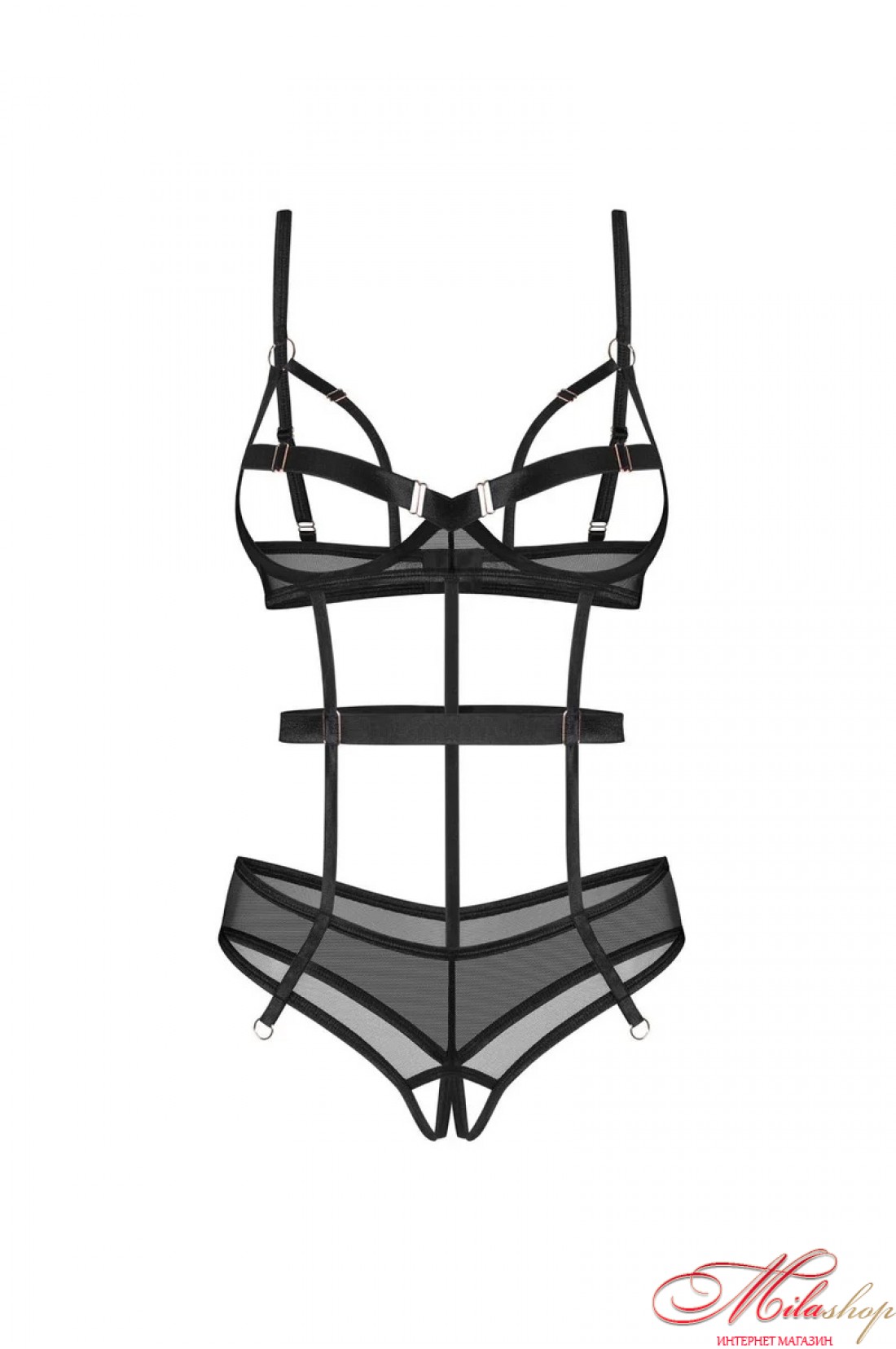 Боди из микросетки с ремешками; открытые чашки с косточками внизу поддерживает грудь и делает ее округлой; лиф застегивается на спине крючками; плечевые бретели регулируются по длине; низ в виде трусиков стрингов; вырез в ластовице.