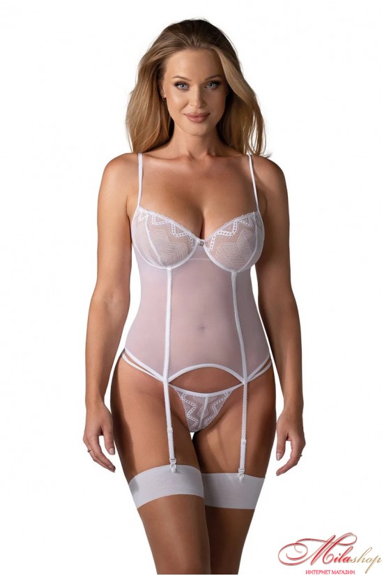 Корсет из прозрачной микросетки, мягкие чашки на косточках поддерживают грудь и подчеркивают их естественную форму, лиф застегивается на спине крючками, плечевые бретели регулируются по длине, не отстегиваются, пажи для чулок отстегиваются, регулируются по длине, трусики стринги входят. Корсет, на тонких бретелях, дополнен откровенными кружевными стрингами. Особенность этого набора – приятные на ощупь материалы. Основание корсета выполнено из шелковистой микросетки, а лиф и трусики — из кружева с такой же текстурой. Традиционные косточки здесь заменены плотными швами на спине и животе: они позволяют модели держать форму, не создавая дискомфорта во время движения и наклонов. Вы сможете вовлечь в любовную игру чувственный танец – ничто вам не будет мешать.