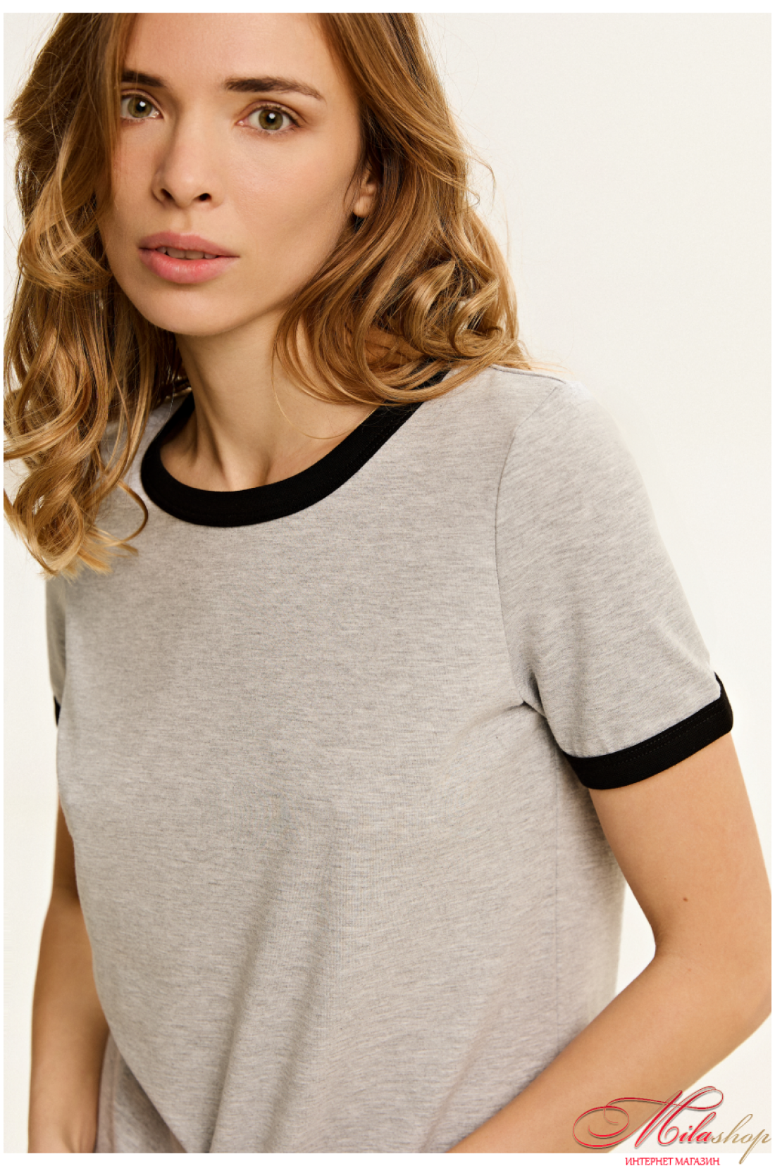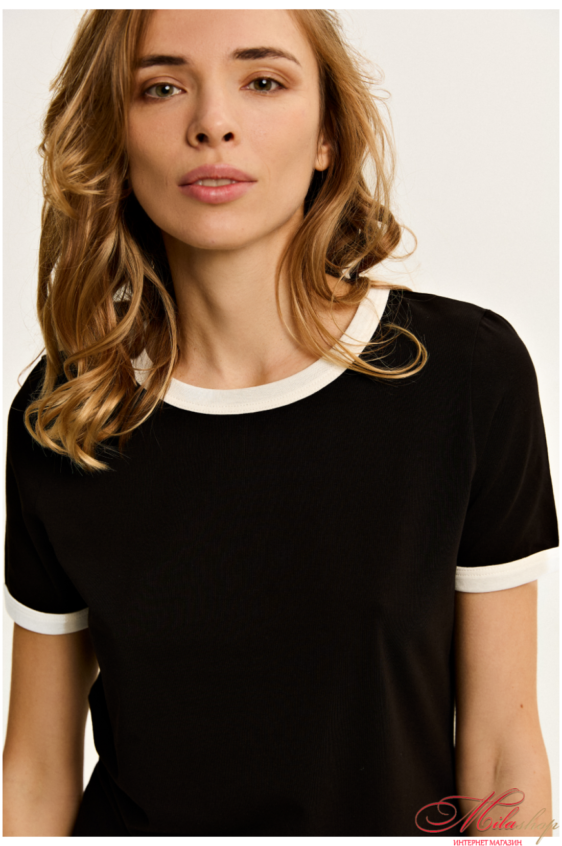 Футболка с контрасными деталями, выполнена из кулира с эластаном. Футболка прямого силуэта, с округлой горловиной. Рукав прямой, полуприлегающий, длиной до середины плеча. Горловина и низы рукавов окантованы контрастной тканью. Классическая и универсальная футболка, дополняющая любой casual образ. 95% – хлопок, 5% – эластан.