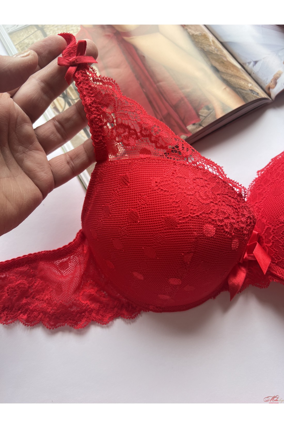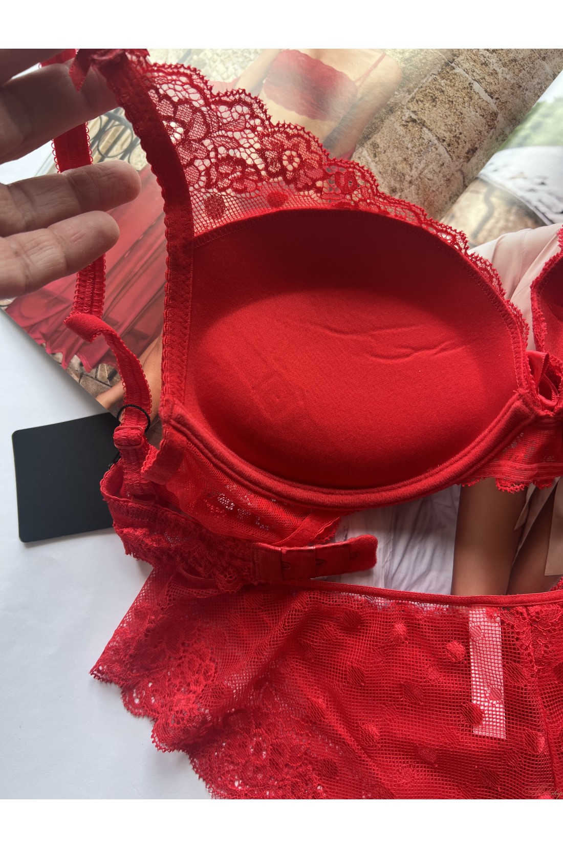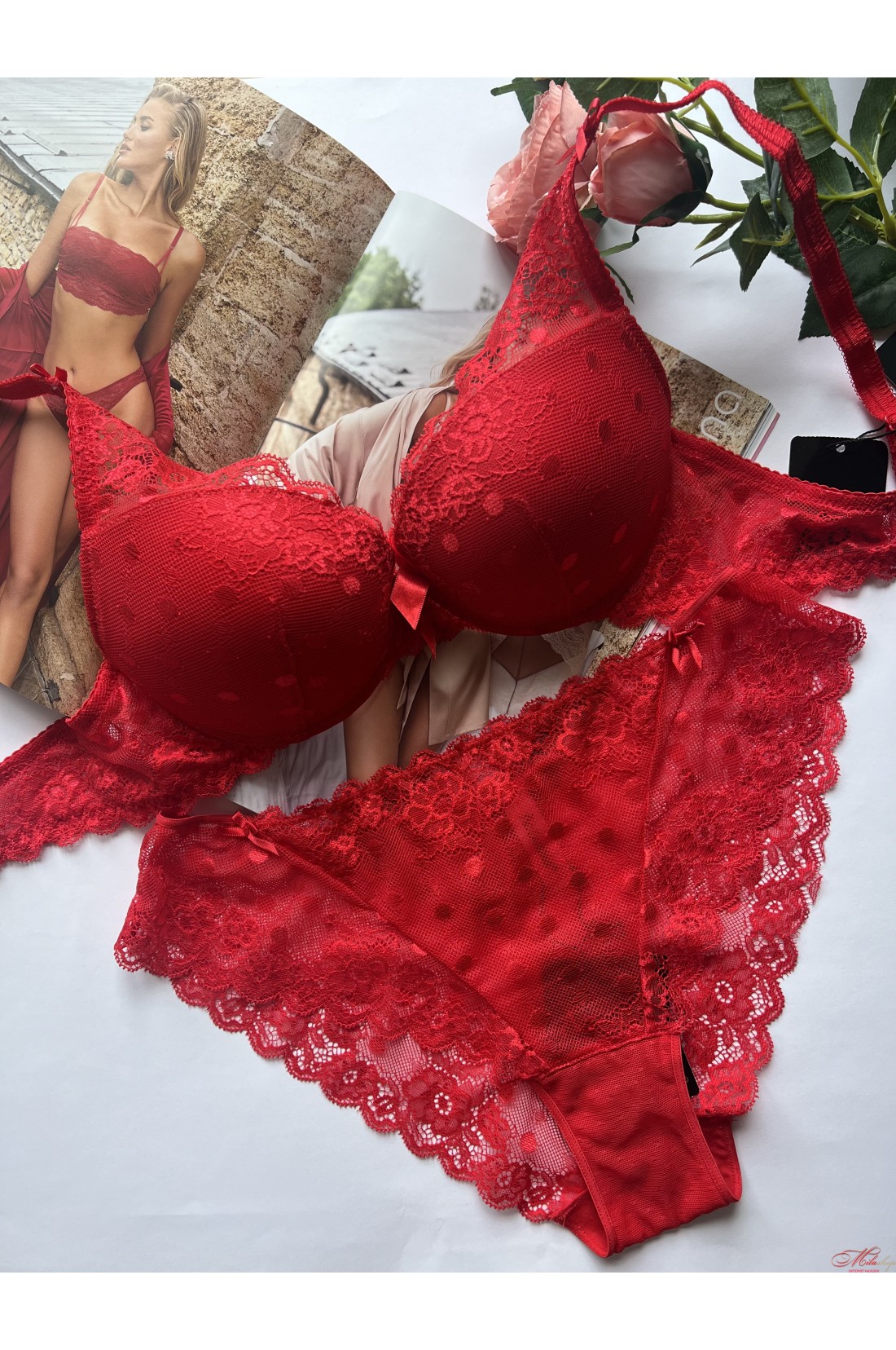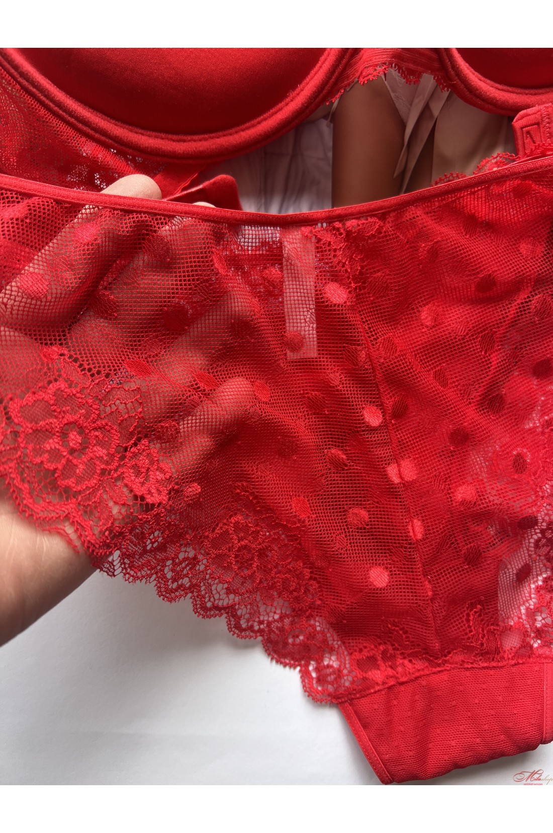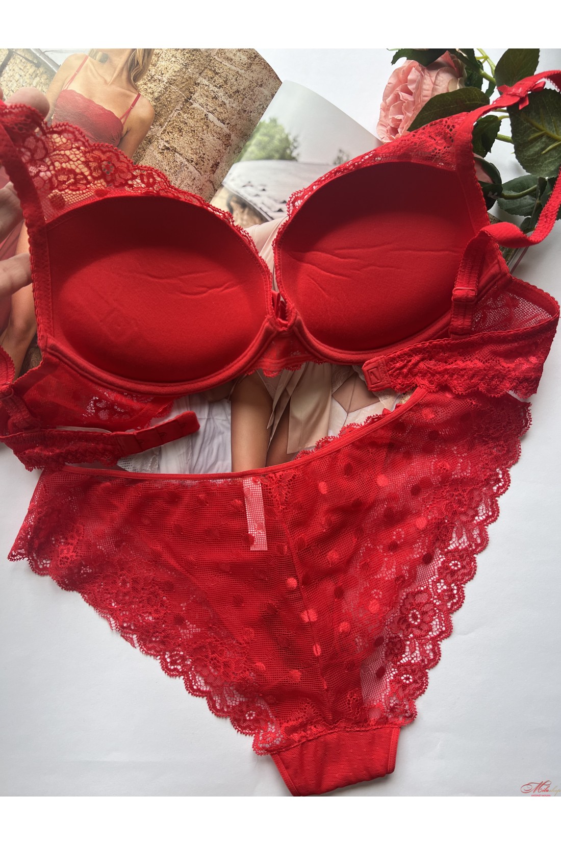 Красивый кружевной комплект, бюст с пуш-ап, регулируемые бретели, кружевно и сетчатое полотно пояс. Трусики слип, сочетание кружева и сетчатого полотна в горошек, хлопковая ластовица.