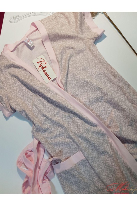 Халат с коротким рукавом и поясом, длина до колена. Состав 92% хлопка, 8% эластана.