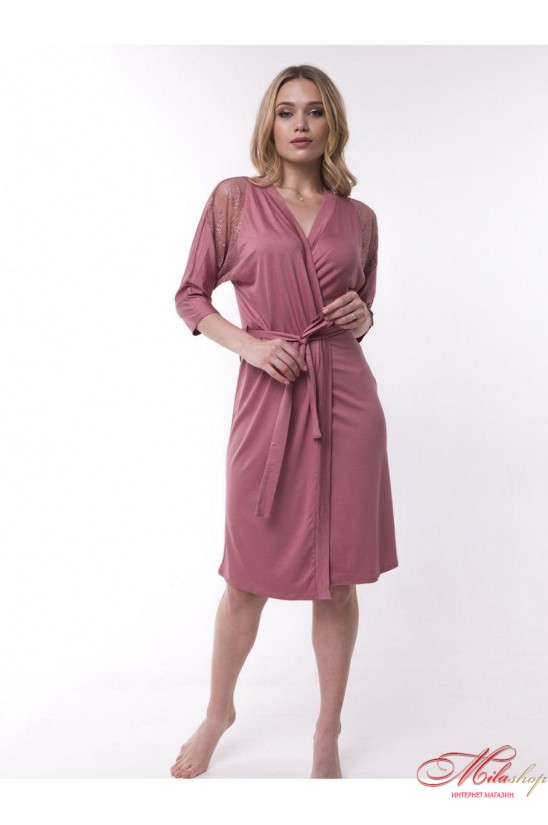Легкий и удобный халат приятный к телу. Отличного качества, не теряет форму и цвет на протяжении длительного периода. Халат прямого силуэта, украшенный кружевными вставками. Рукав 3/4, V-образный вырез, изделие запахивается на пояс.