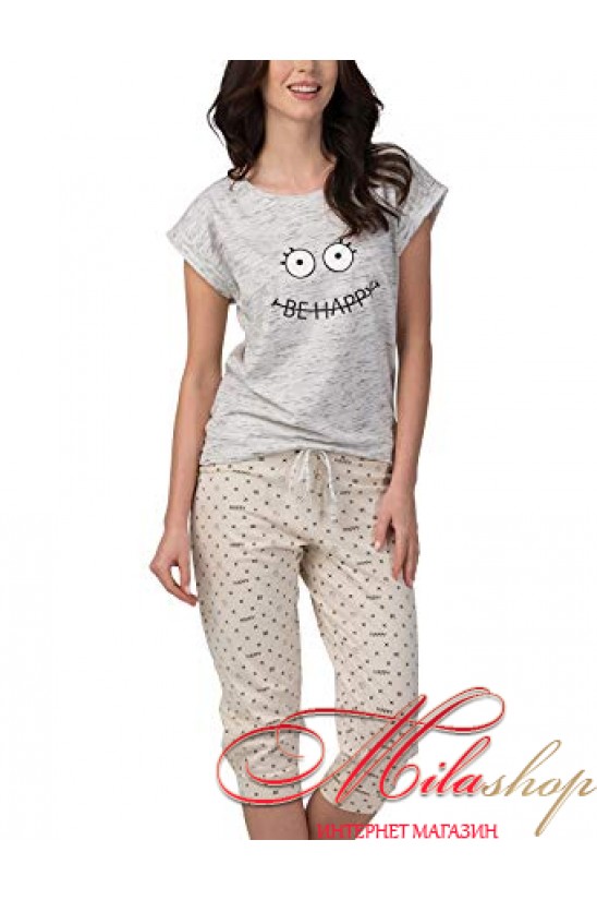 Изумительная пижама, состоит из футболки с коротким рукавом и бриджей. Крой свободный, низ на шнуровке. На футболке оригинальный принт. Выполнена из качественного хлопка.