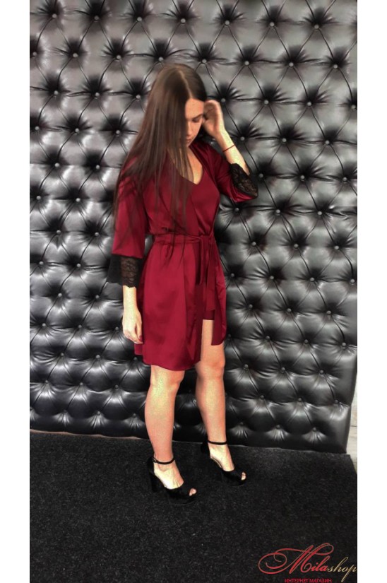 Очаровательный халатик, на запах под пояс. Выполнен из мягкого шелка, рукава красиво украшены изумительным кружевом. Без капюшона и карманов. Длина до колена.
