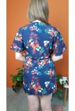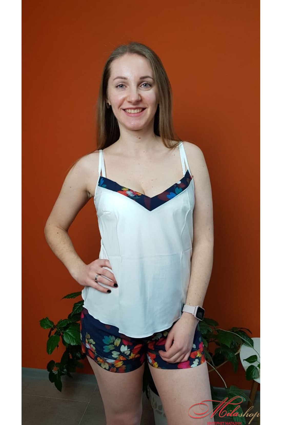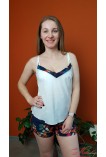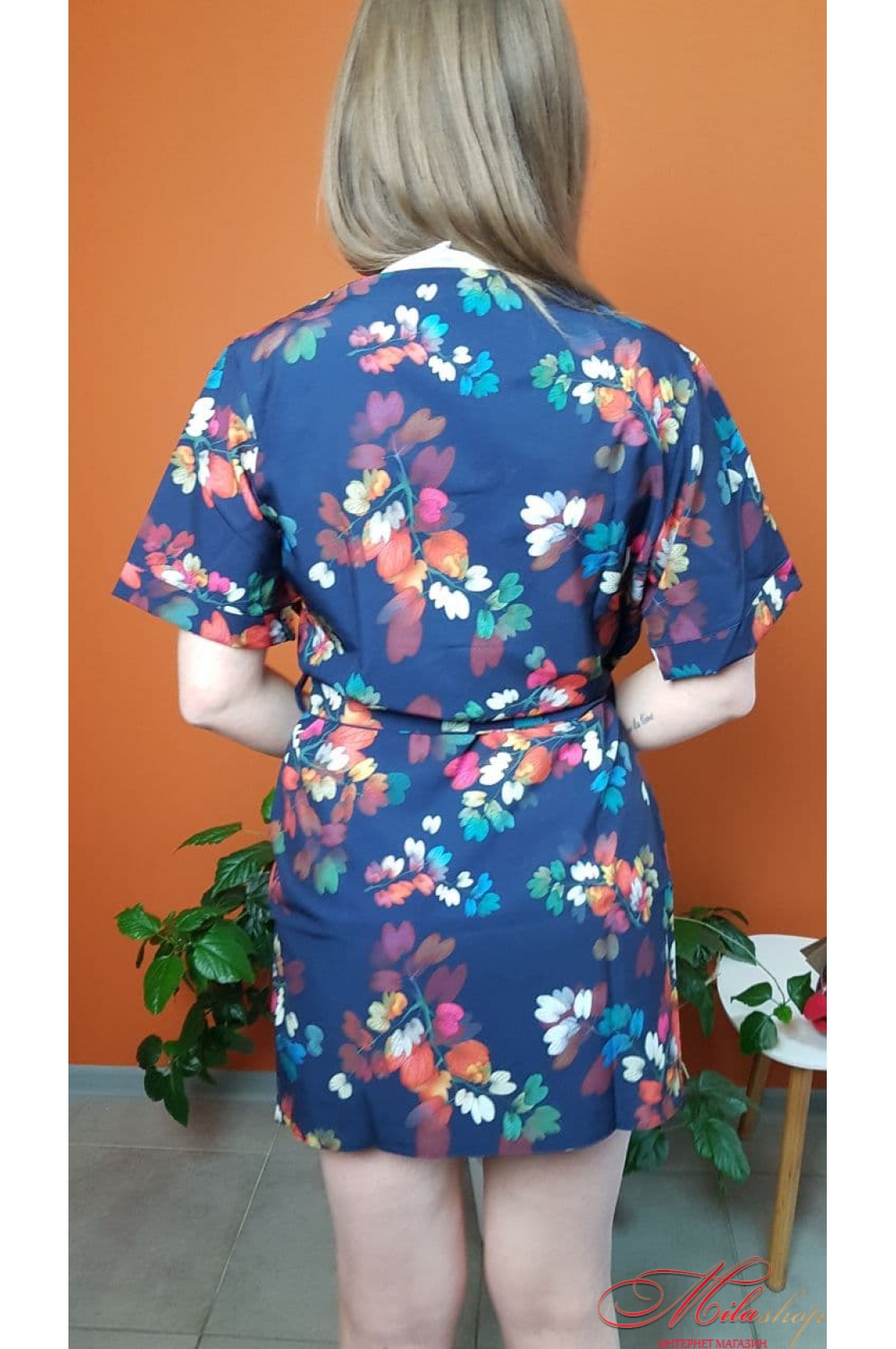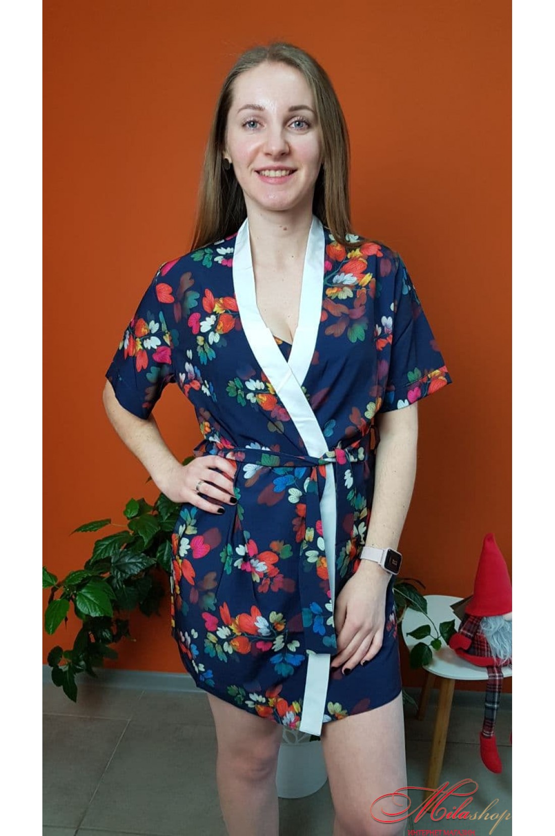 Легкий комплект из халата и костюма выполнен из нежного сатина. Майка на тонких бретелях, которые регулируются по длине. Шорты короткие на резинке. Халат с запахом под пояс, внутри с завязкой. Рукава короткие.
