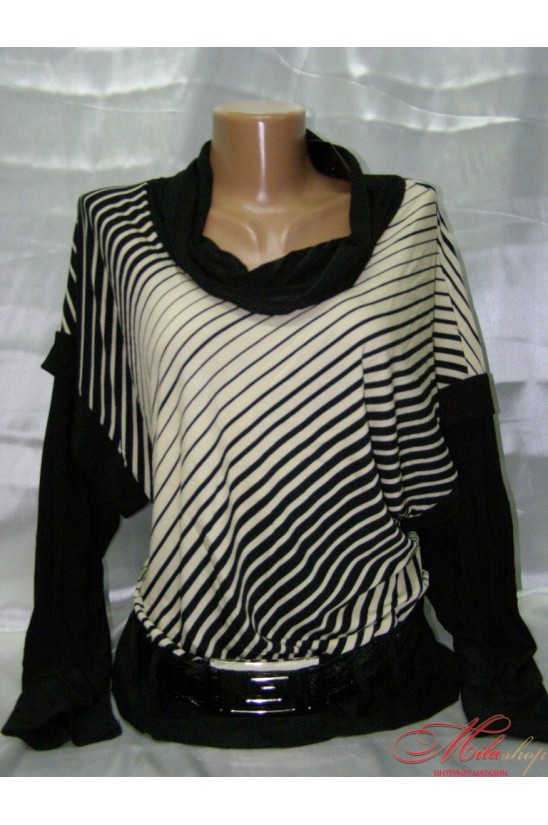 Женская блуза с длинным рукавом. Воротник - хомут. Блузу украшают косые полосы, которые зрительно стройнят и вытягивают фигуру. В комплекте завязывающийся пояс, имитирующий лакированую кожу.