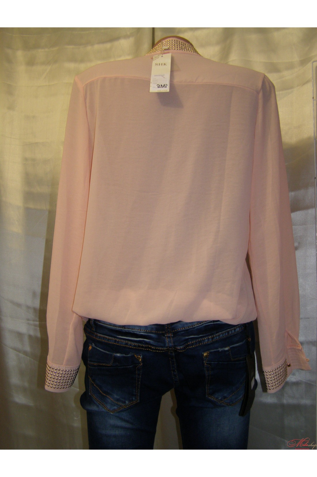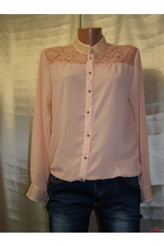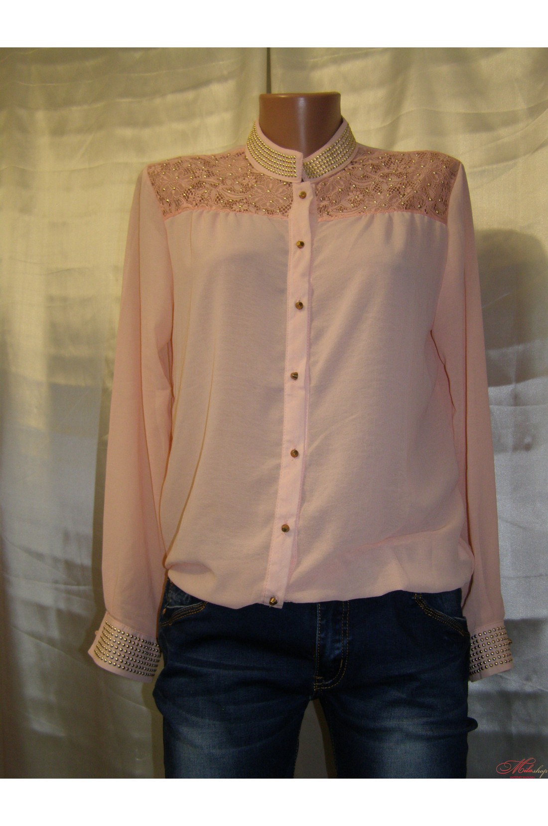 Женская блуза с длинным рукавом. Выполнена из нежнейшего шифона. На пуговицах. Воротник стойка украшен декоративными элементами. Верхняя часть блузы с кружевными вставками. Нижняя часть блузы на резинке. Хорошо сочетается с джинсами и юбками.