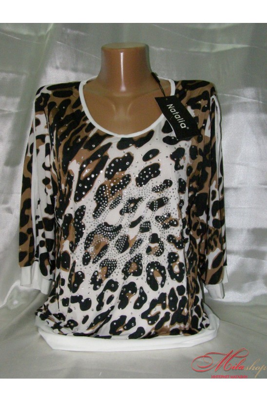 Женская блуза с леопардовым орнаментом. Рукав три четверти. Спереди блуза украшена стразами. Лагодаря такому сочетанию цветов выглядит освежающе и нарядно.