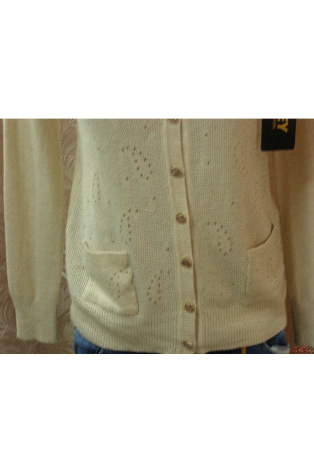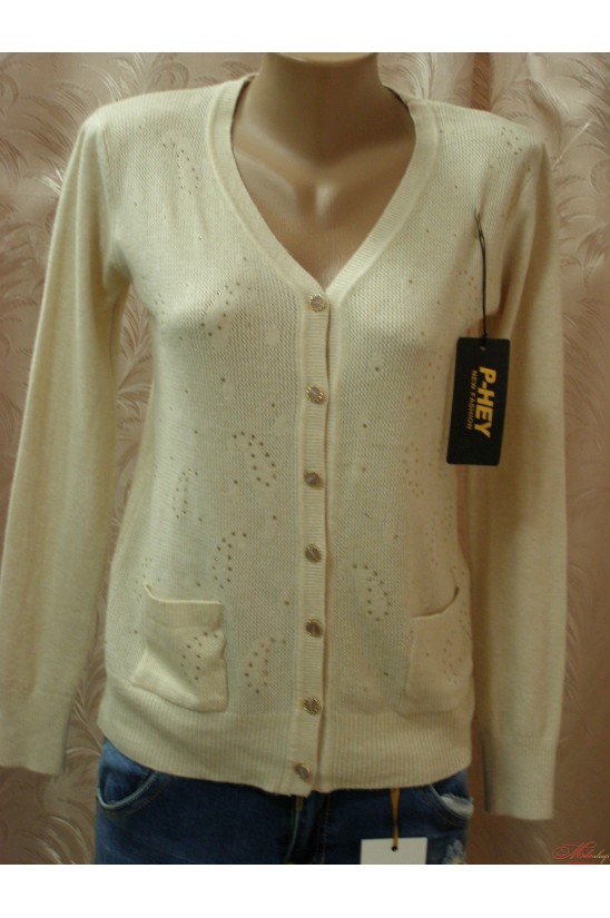Женская кофта на пуговицах, спереди два кармана, украшена нитями люрекса. Размер универсальный (хорошо садится на 46-48)