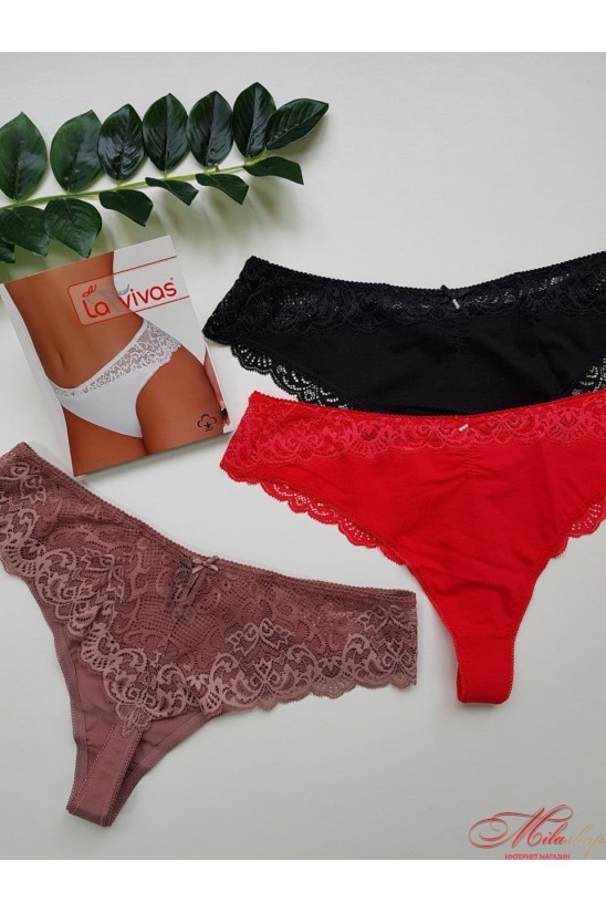 Женские трусики-стринги с высокой линией талии. Выполнены из высококачественного хлопка. Украшены кружевом по задней детали. Задняя часть декорирована бантиками.