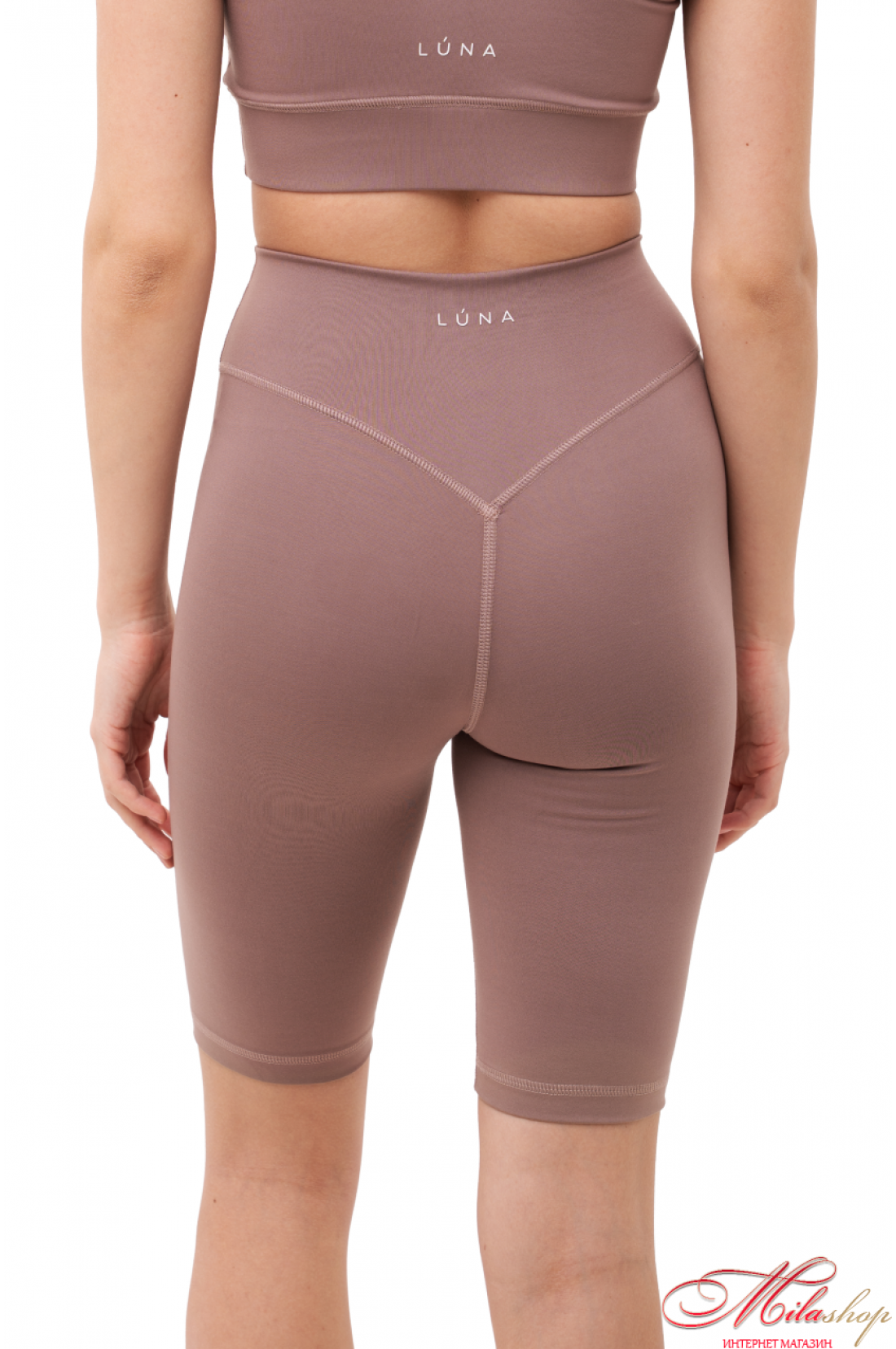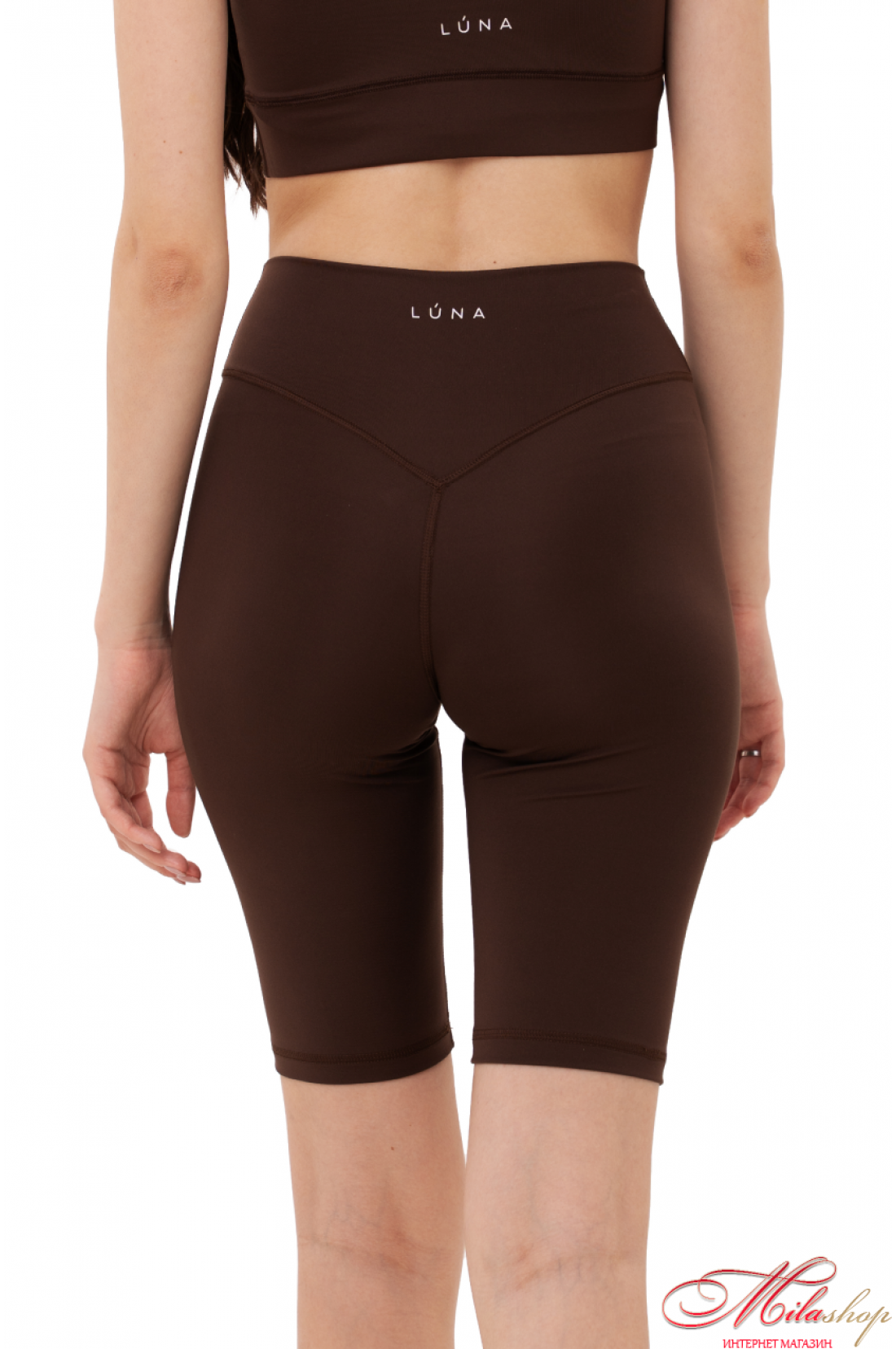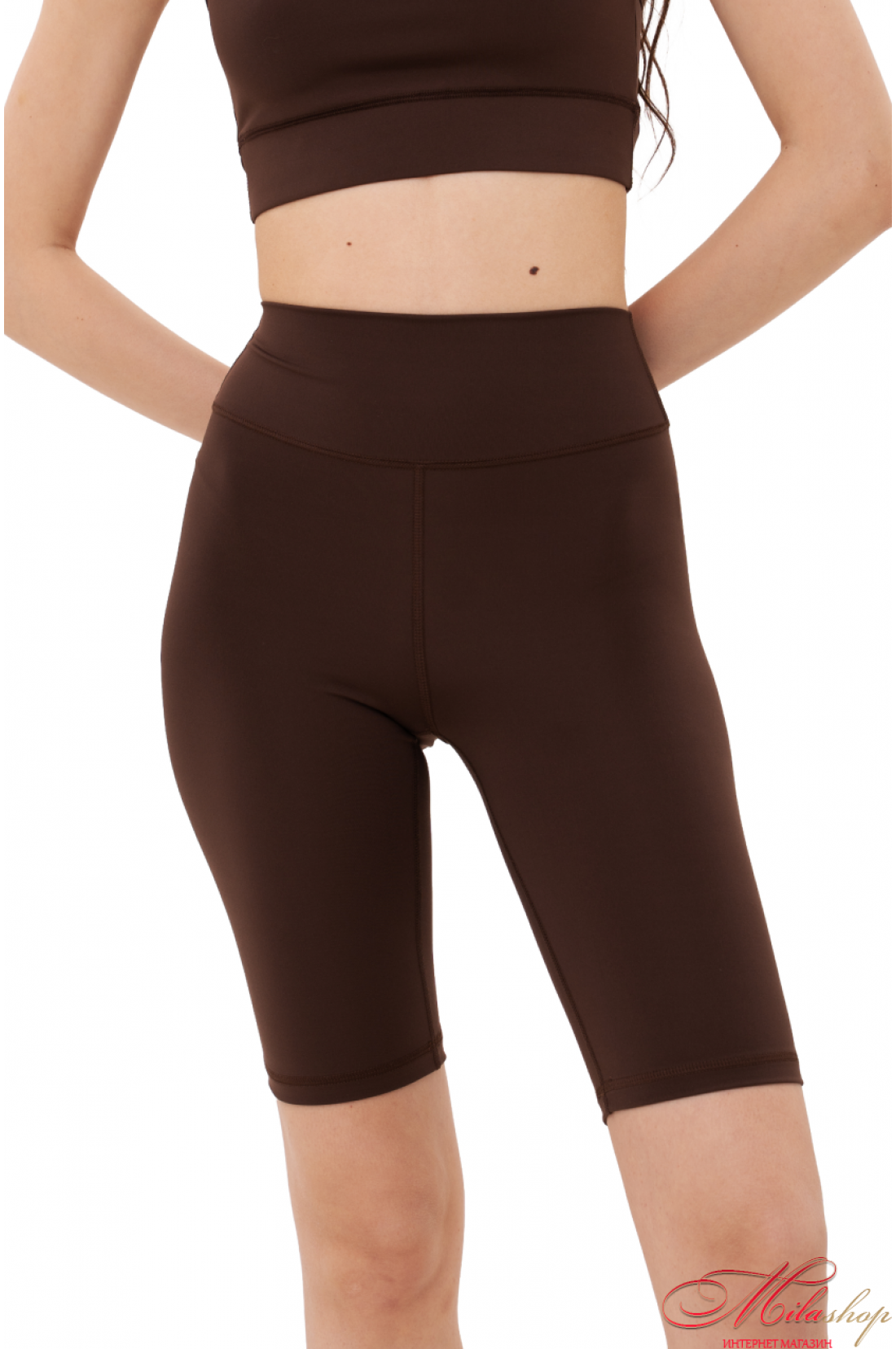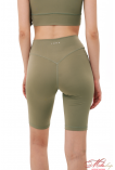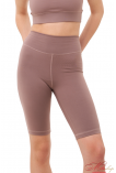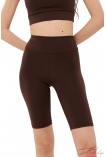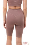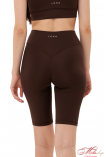 Велосипедки классического кроя, с отрезной кокеткой, имеющей V-образную ворму по спинке, и подчеркивает ягодичную форму. По центру кокентки спинки – брендирование. Длина велосипедов до колена. Ткань - бифлекс, хорошо тянется, имеет гладкую фактуру, цвет капучино имеет большую плотность, но меньше тянется, это учтено в лекалах. Состав ткани – 100% polyester.