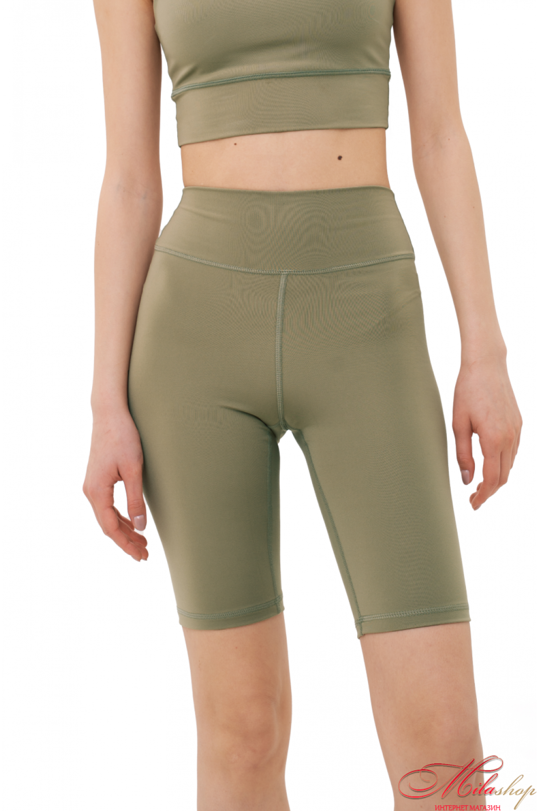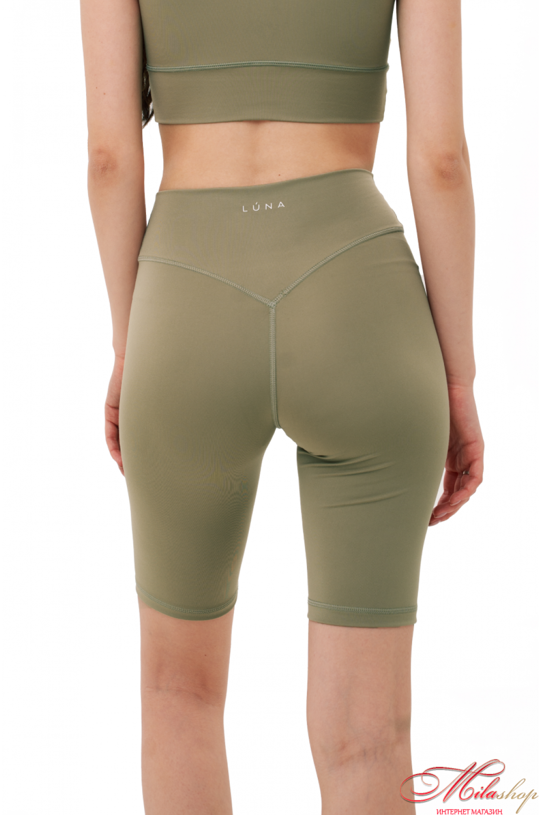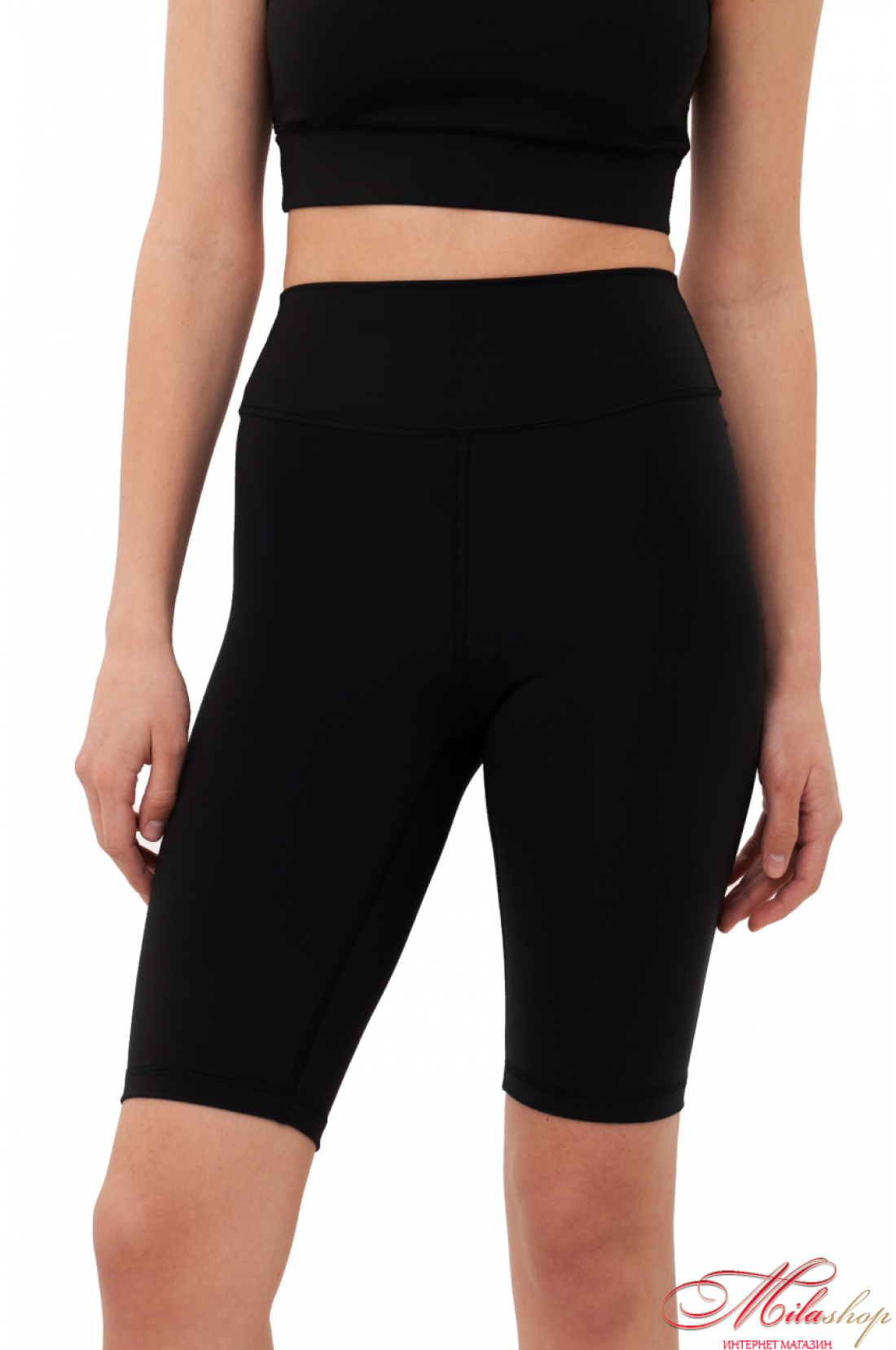 Велосипедки классического кроя, с отрезной кокеткой, имеющей V-образную ворму по спинке, и подчеркивает ягодичную форму. По центру кокентки спинки – брендирование. Длина велосипедов до колена. Ткань - бифлекс, хорошо тянется, имеет гладкую фактуру, цвет капучино имеет большую плотность, но меньше тянется, это учтено в лекалах. Состав ткани – 100% polyester.