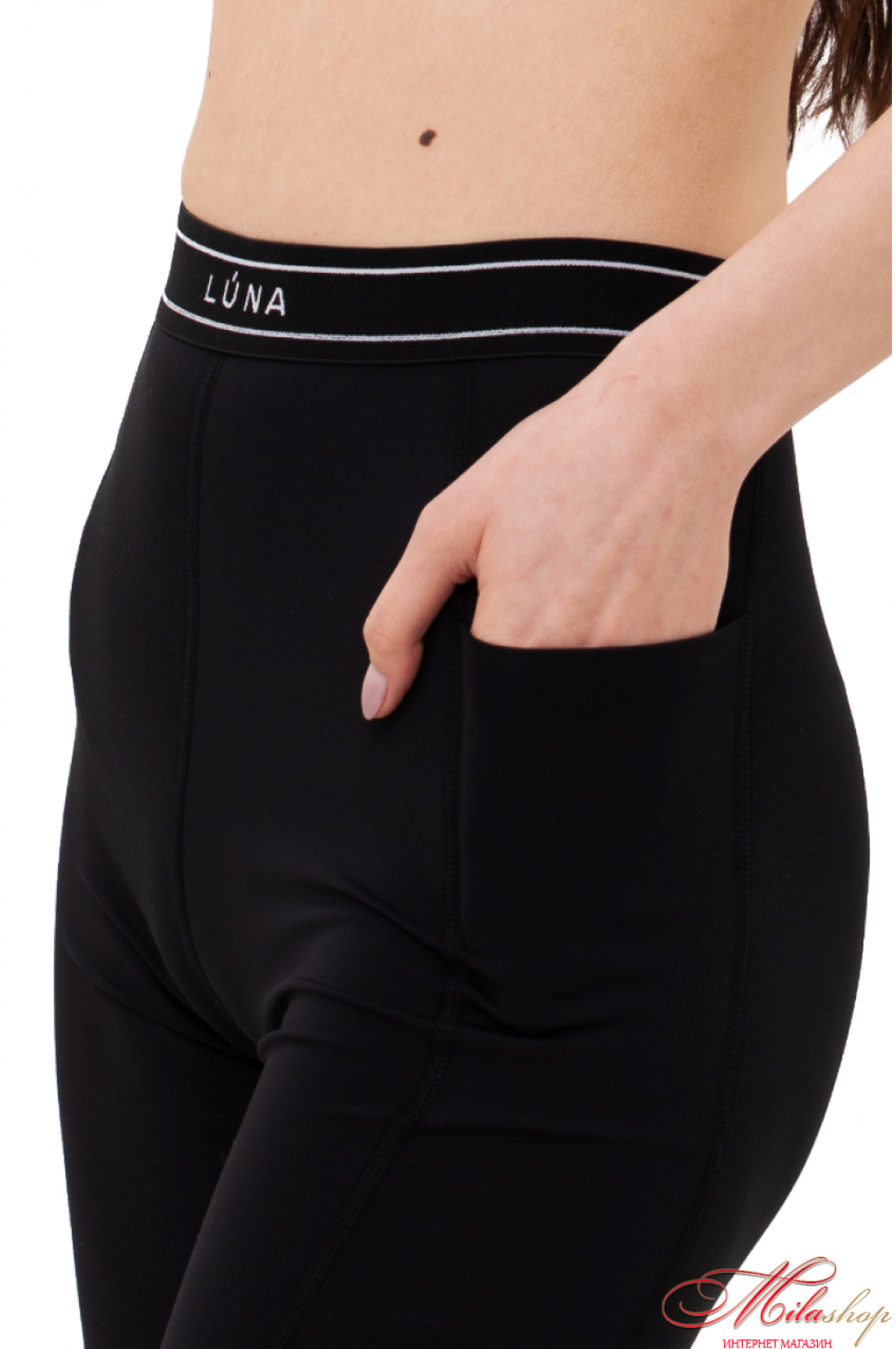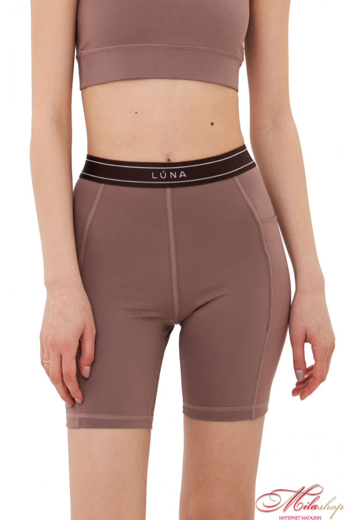 Треки с поясом-брендированной резинкой, с рельефами по бокам, в бочек с левой стороны вставлен карман, в который хорошо вмещается телефон. Длина треков – до середины бедра. Ткань - бифлекс, хорошо тянется, имеет гладкую фактуру, цвет капучино имеет большую плотность, но меньше тянется, это учтено в лекалах. Состав ткани – 100% polyester.