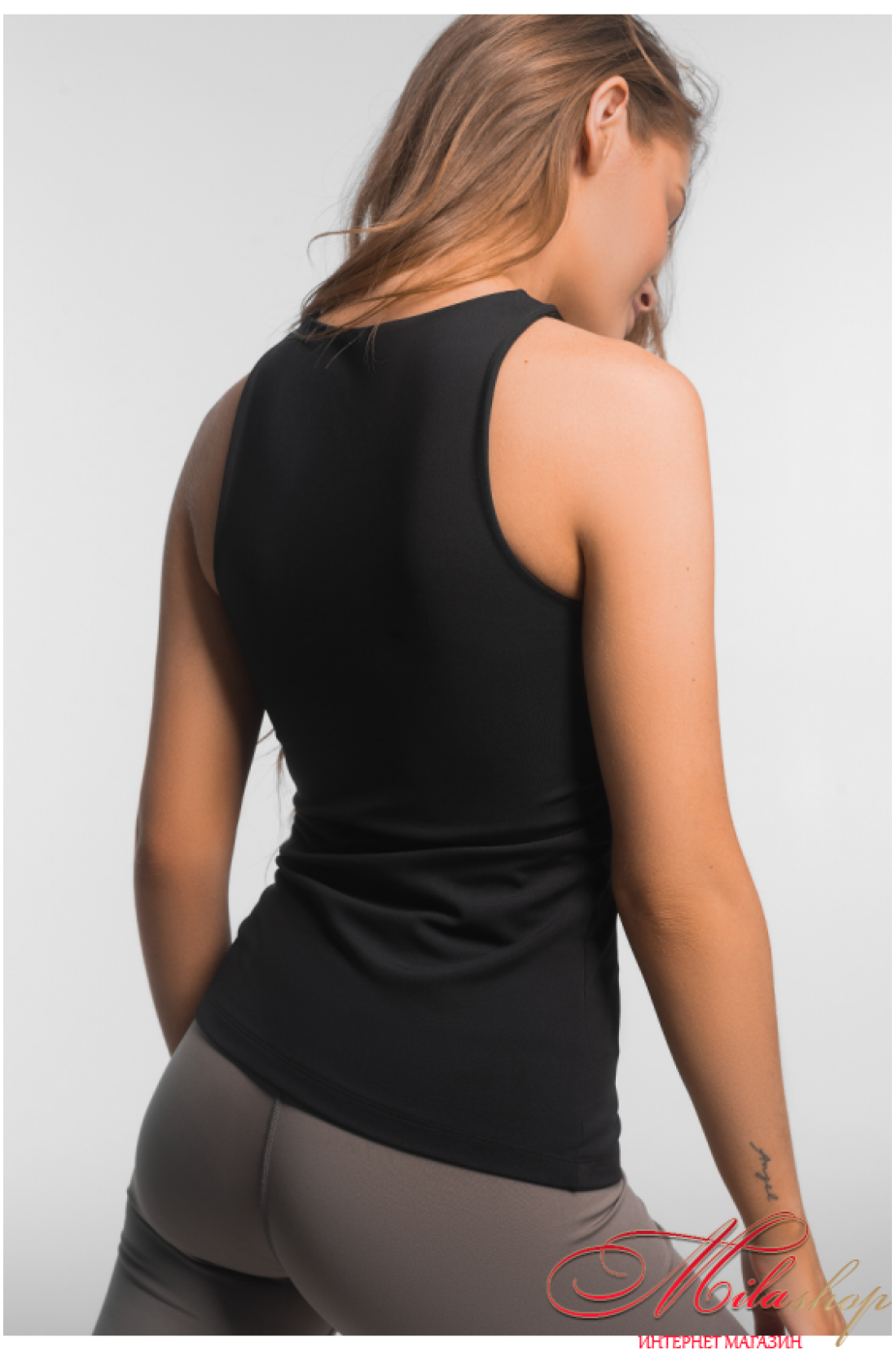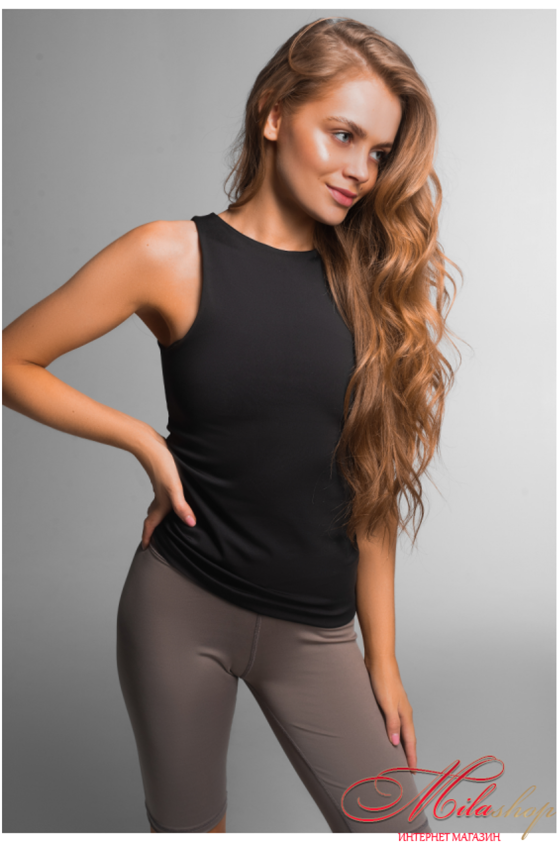 Майка удлинена из спортивной микрофибры. Из плотного материала. Имеет двойную конструкцию ткани в зоне груди, чтобы иметь комфортное и уверенное движение и возможность ношения без бра. Высокая посадка выреза воротничка. Майка обладает универсальной конструкцией и дизайном, которые могут быть стильным дополнением повседневного лука, комфортным комплектом для спорта и удобным элементом домашней одежды.